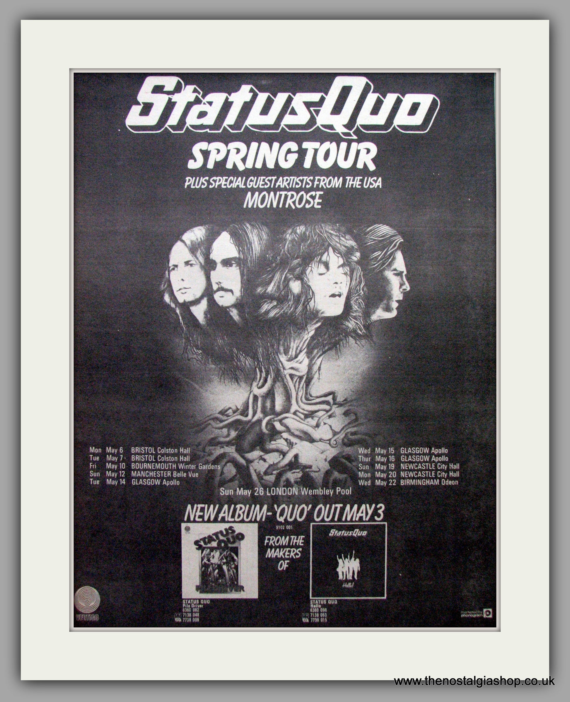 Status Quo. Spring Tour with Montrose. Vintage Advert. This is a large classic Original advert 1974. Presented in cream bevel cut mount with backing card and clear bag. Ready to fit in 20 x 16 inch frame. The mounted advert will be posted via courier and well packed - protected with a sheet of hardboard to keep it rigid. Any questions or inquiries, please get in touch, we are here to help! All our adverts, unless clearly stated are Originals from the date shown. They make excellent pieces of wall art and stunning gifts. Many are rare and hard to find and once sold, may not be replaced. Remember you are buying a piece of history. Website watermark is not on original .