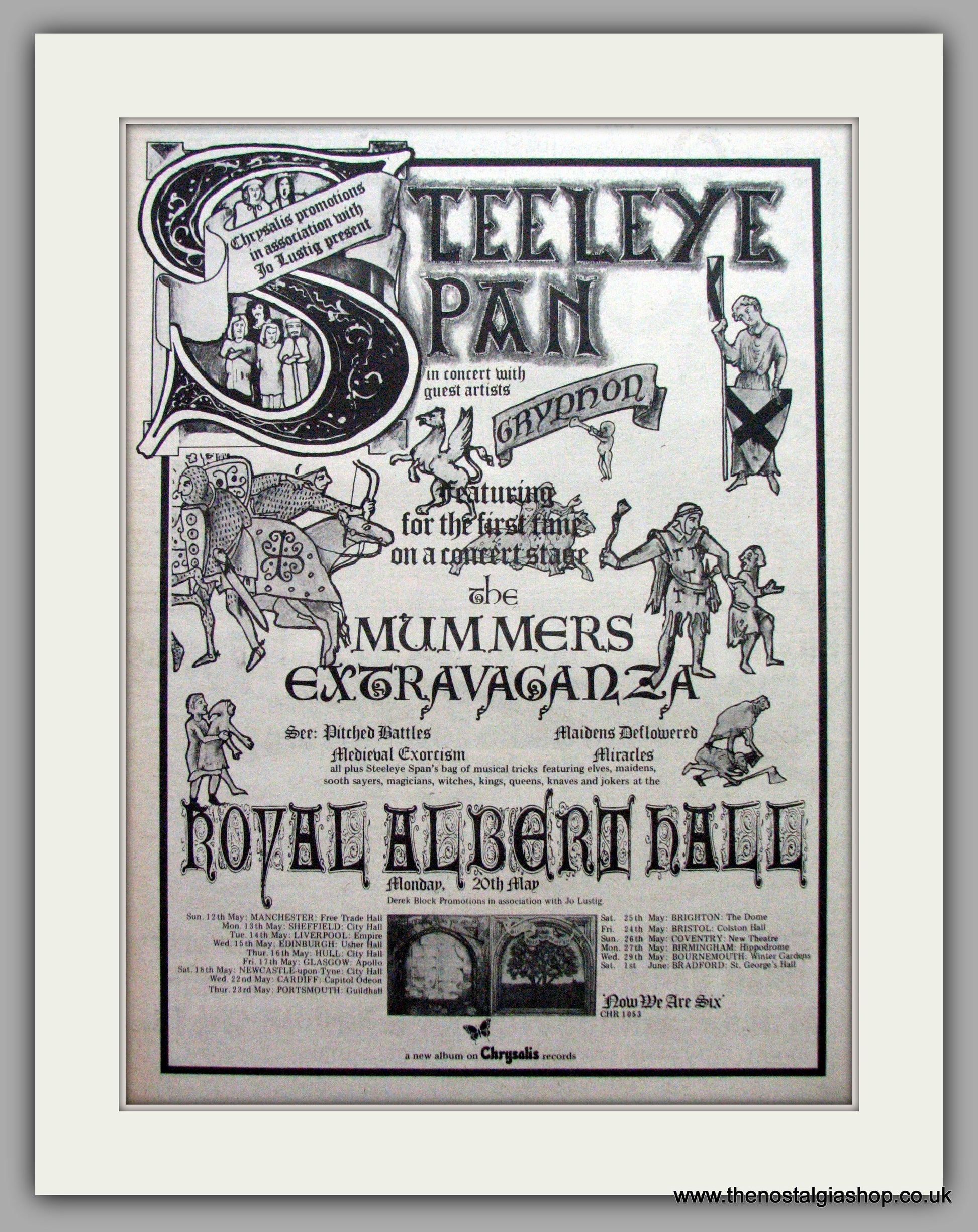Steeleye Span. Royal Albert Hall. Vintage Advert 1974 (ref AD9599). Presented and supplied in a cream bevel cut mount with backing card and clear bag. Ready to fit in a 20x16 inch frame. The mounted advert will be posted via courier and well packed - protected with a sheet of hardboard to keep it rigid. Any questions or enquiries, please get in touch, we are here to help! All our adverts, unless clearly stated are originals from the date shown. They make excellent pieces of wall art and stunning gifts. Many are rare and hard to find and once sold, may not be replaced. Remember you are buying a piece of history. Website watermark is not on original.
