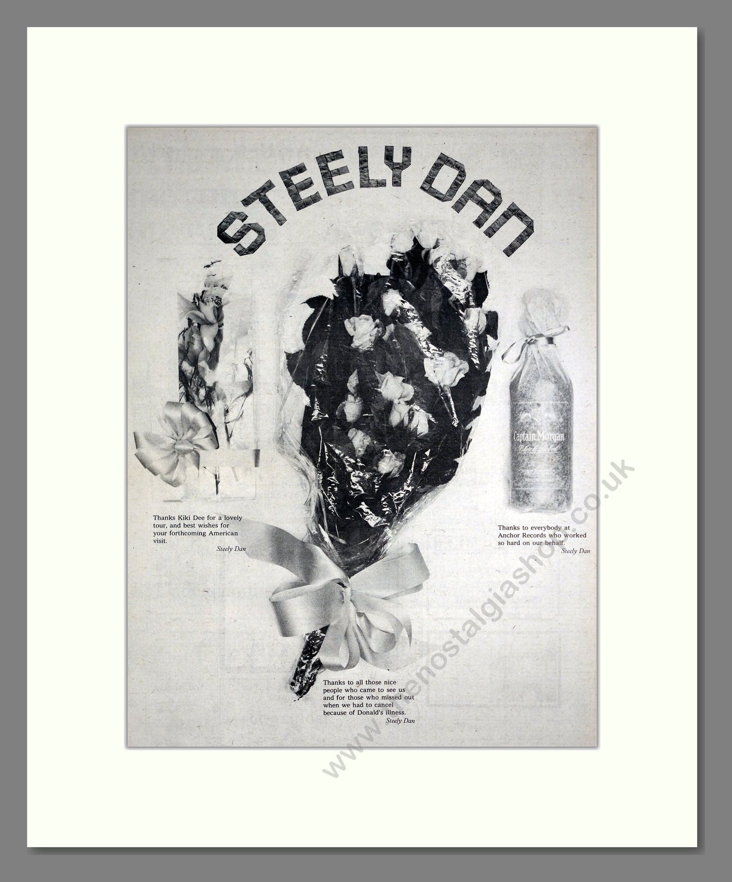 Steely Dan - Thank You. Vintage Advert. This is a large classic original advert from 1974. Presented and supplied in a cream bevel cut mount with backing card and clear bag. Ready to fit in a 20 x 16 inches frame. The mounted advert will be posted via courier and well packed - protected with a sheet of hardboard to keep it rigid. Any questions or enquiries, please get in touch, we are here to help! All our adverts, unless clearly stated are originals from the date shown. They make excellent pieces of wall art and stunning gifts. Many are rare and hard to find and once sold, may not be replaced. Remember you are buying a piece of history. Website watermark is not on original.