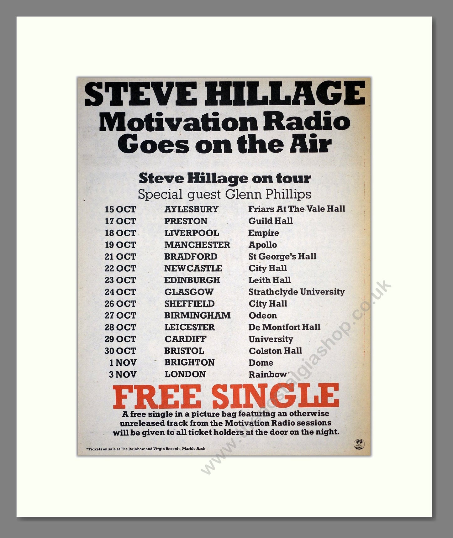 Steve Hillage - UK Tour. Vintage Advert. This is a large classic original advert from 1977. Presented and supplied in a cream bevel cut mount with backing card and clear bag. Ready to fit in a 20 x 16 inches frame. The mounted advert will be posted via courier and well packed - protected with a sheet of hardboard to keep it rigid. Any questions or enquiries, please get in touch, we are here to help! All our adverts, unless clearly stated are originals from the date shown. They make excellent pieces of wall art and stunning gifts. Many are rare and hard to find and once sold, may not be replaced. Remember you are buying a piece of history. Website watermark is not on original.
