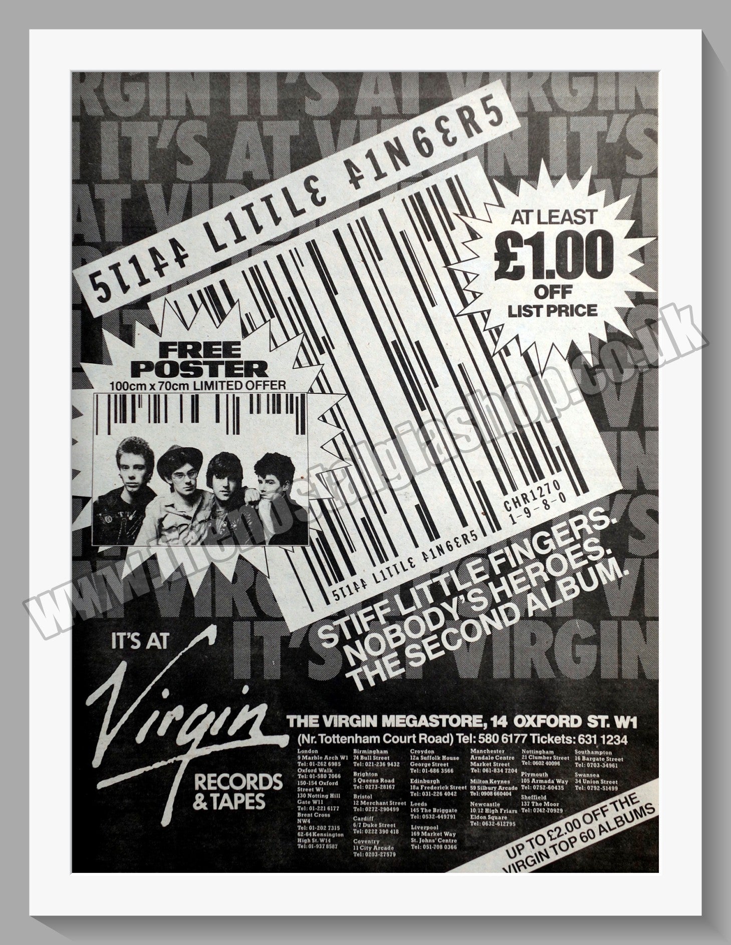 Stiff Little Fingers Nobody's Heroes. Vintage Advert. This is a large Original advert 1980. Presented and Supplied in a 20 x 16 Inch, cream bevel cut mount with backing card and clear bag. Ready to frame. The mounted advert will be posted via courier and well packed - protected with a sheet of hardboard to keep it rigid. Any questions or inquiries, please get in touch, we are here to help! All our adverts, unless clearly stated are Originals from the date shown. They make excellent pieces of wall art and stunning gifts. Many are rare and hard to find and once sold, may not be replaced. Remember you are buying a piece of history. Website watermark is not on original.