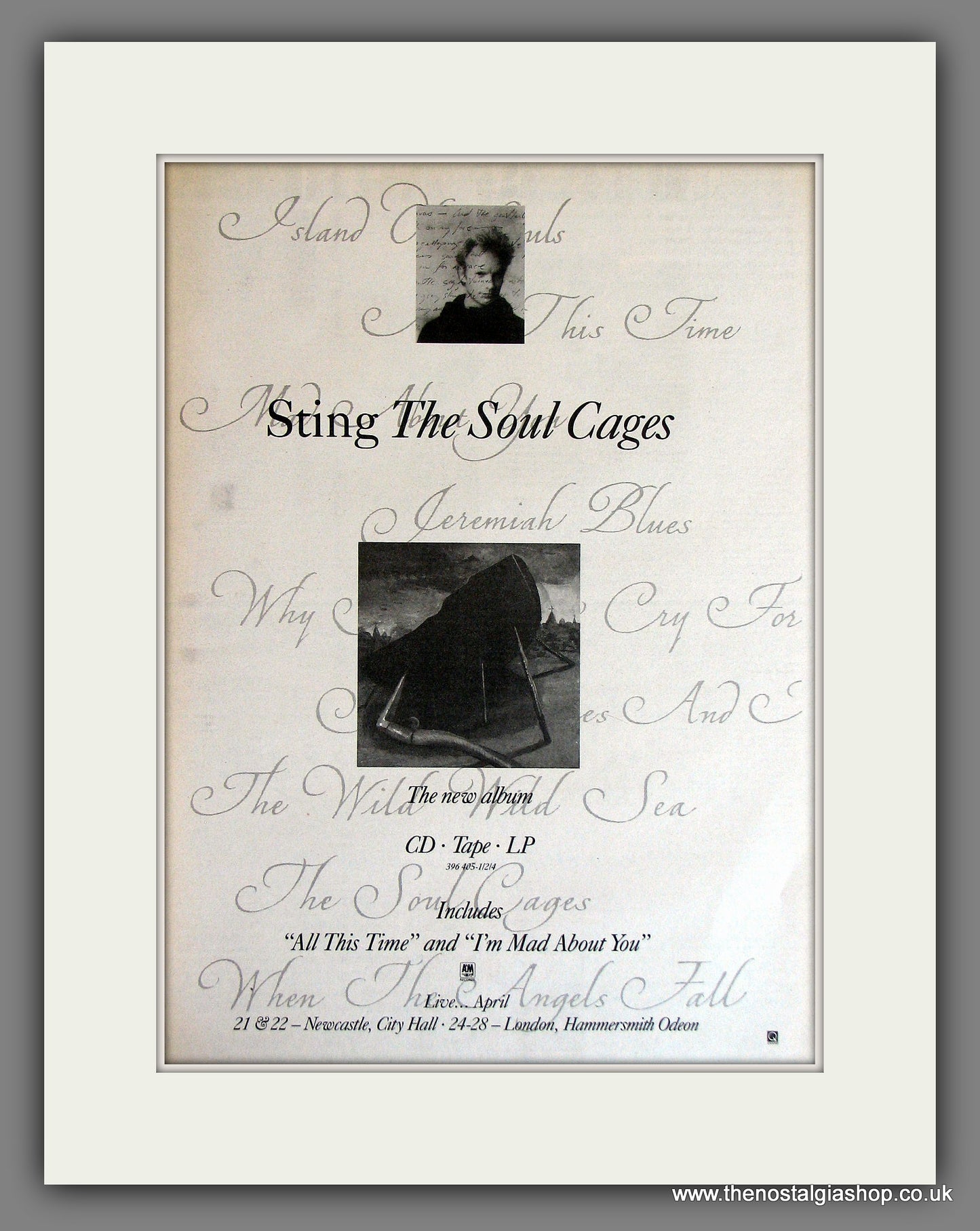 Sting The Soul Cages. Original Advert 1991 (ref AD13772). Presented and supplied in a cream bevel cut mount with backing card and clear bag. Ready to fit in a 20x16 inch frame. The mounted advert will be posted via courier and well packed - protected with a sheet of hardboard to keep it rigid. Any questions or enquiries, please get in touch, we are here to help! All our adverts, unless clearly stated are originals from the date shown. They make excellent pieces of wall art and stunning gifts. Many are rare and hard to find and once sold, may not be replaced. Remember you are buying a piece of history. Website watermark is not on original.