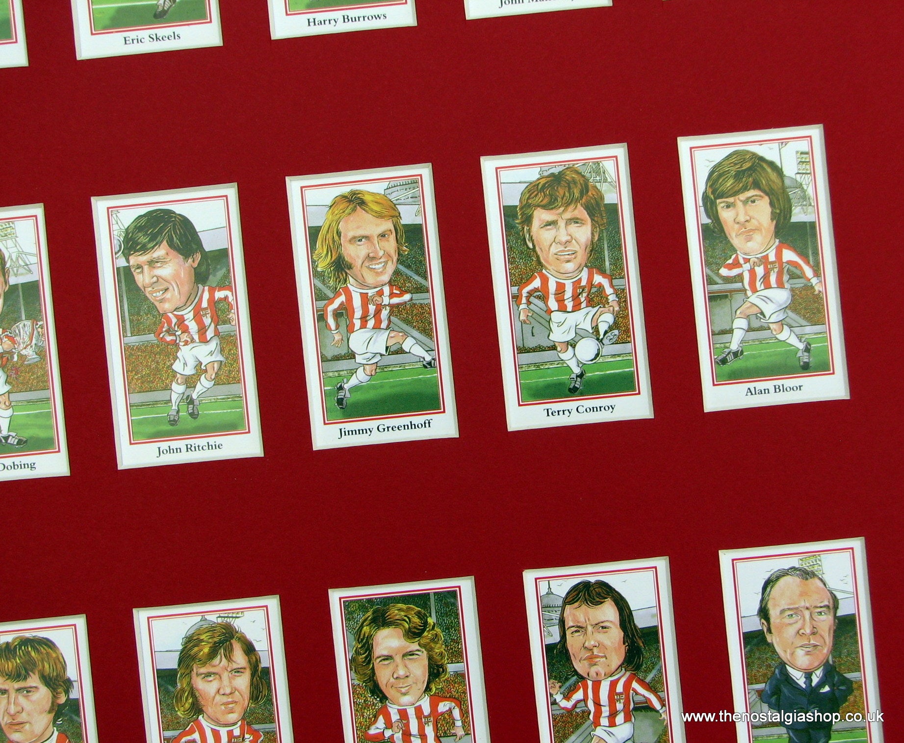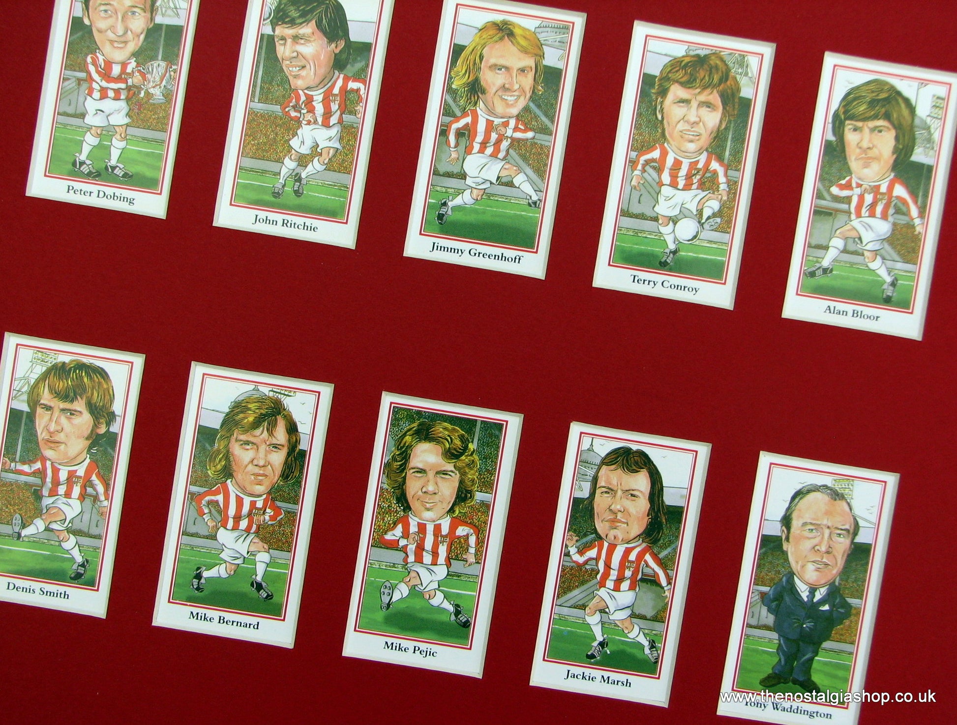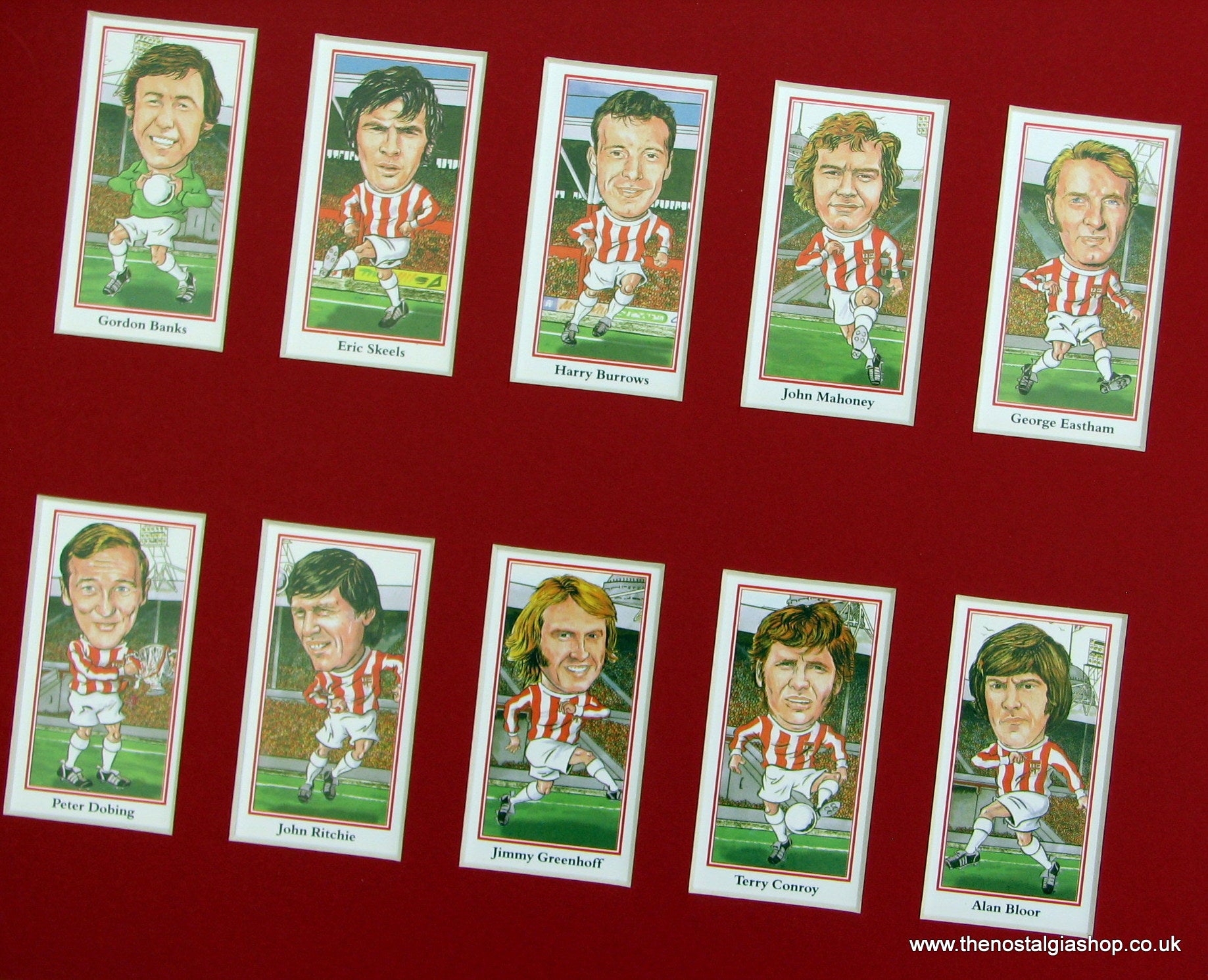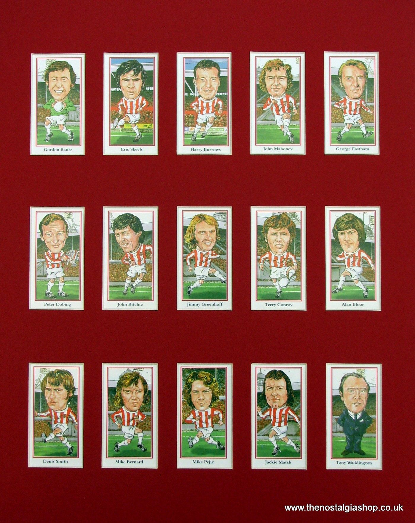 Stoke 1970's Heroes. Mounted card set of beautifully illustrated caricatures. Presented fixed in Red mount with backing board. Players featured are; Gordon Banks, Eric Skeels, Harry Burrows, John Mahoney, George Eastham, Peter Dobing, John Richie, Jimmy Greenhoff, Terry Conroy, Alan Bloor, Denis Smith, Mike Bernard, Mike Pejic, Jackie Marsh and Manager Tony Waddington. Rear of cards not viewable. Made to fit straight into 14x11 inch frame. Want It Framing? If so, add this to your basket, then go to the Frames Available Category, Click to add the frame of your choice. We will then assemble and post the set to you. Other teams available.