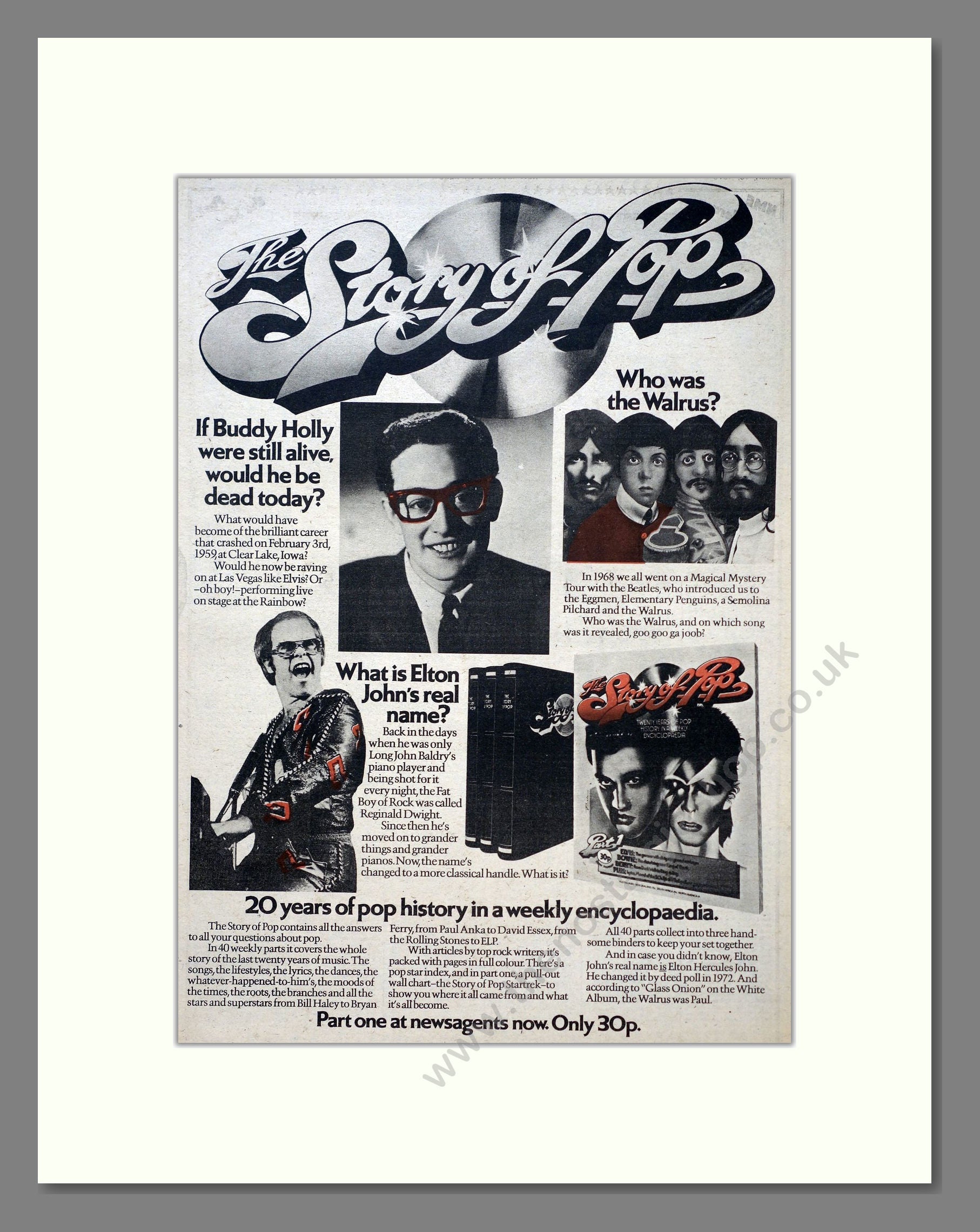 Story Of Pop (The) - Weekly Encyclopaedia. Vintage Advert. This is a large classic original advert from 1975. Presented and supplied in a cream bevel cut mount with backing card and clear bag. Ready to fit in a 20 x 16 inches frame. The mounted advert will be posted via courier and well packed - protected with a sheet of hardboard to keep it rigid. Any questions or enquiries, please get in touch, we are here to help! All our adverts, unless clearly stated are originals from the date shown. They make excellent pieces of wall art and stunning gifts. Many are rare and hard to find and once sold, may not be replaced. Remember you are buying a piece of history. Website watermark is not on original.