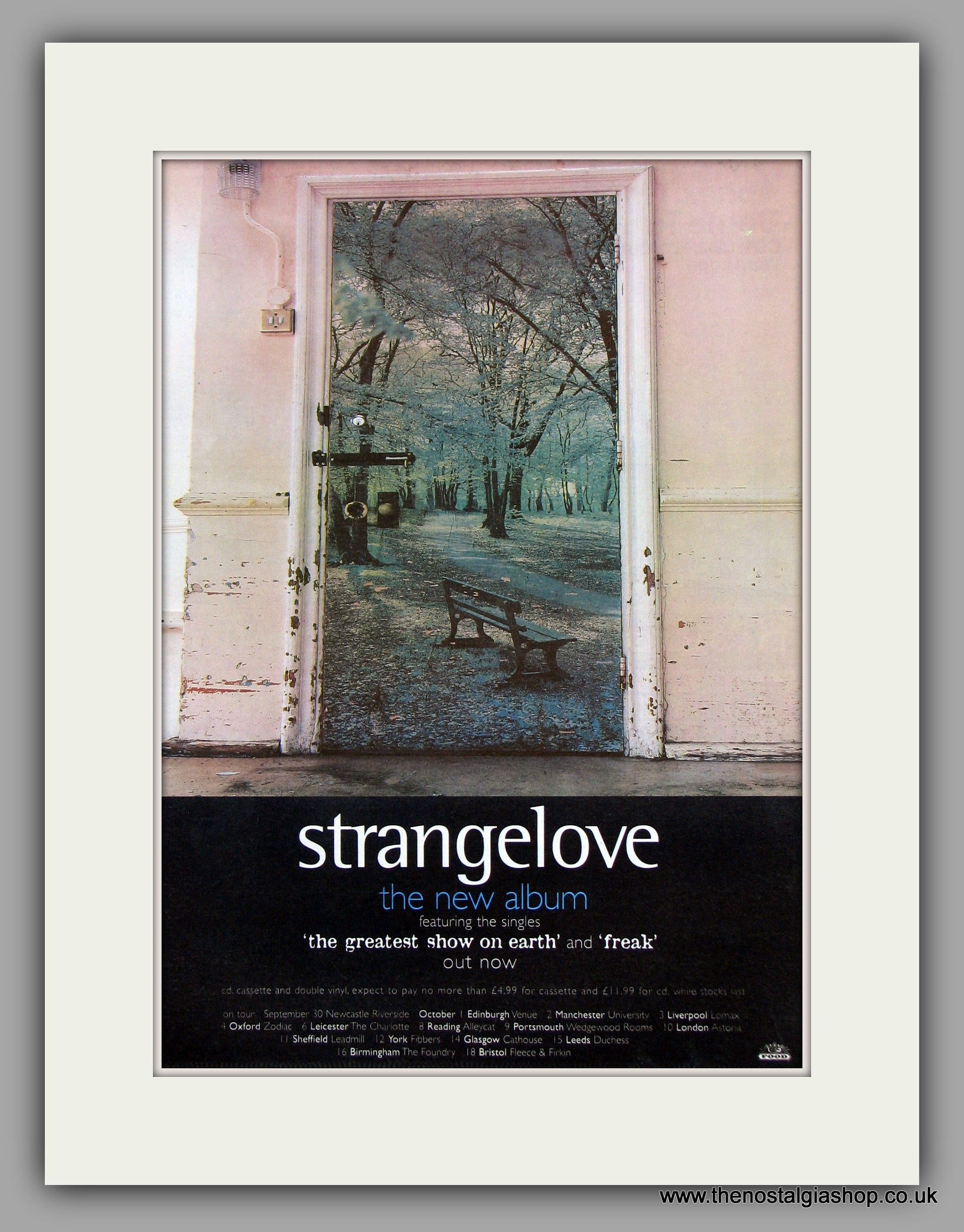 Strange Love The New Album. Original Vintage Advert 1997 (ref AD10181). Presented and supplied in a cream bevel cut mount with backing card and clear bag. Ready to fit in a 20x16 inch frame. The mounted advert will be posted via courier and well packed - protected with a sheet of hardboard to keep it rigid. Any questions or enquiries, please get in touch, we are here to help! All our adverts, unless clearly stated are originals from the date shown. They make excellent pieces of wall art and stunning gifts. Many are rare and hard to find and once sold, may not be replaced. Remember you are buying a piece of history. Website watermark is not on original.