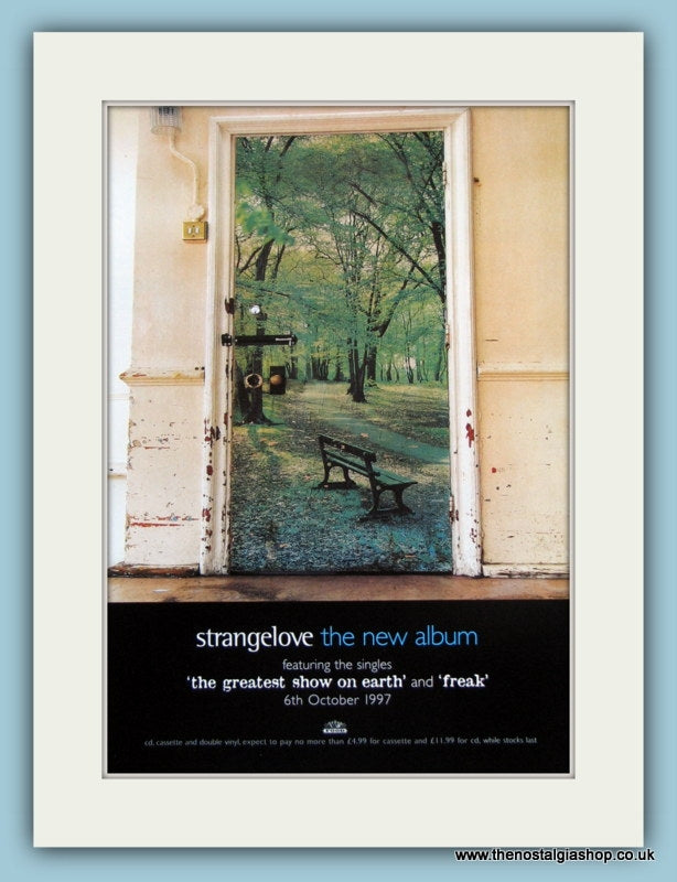 Strangelove. The New album. Featuring the singles 'the greatest show on earth' and 'freak'. Classic original advert 1997. Presented in cream bevel cut mount with backing card and clear bag. Ready to fit in 14 x 11 inch frame. Want it framing? If so, buy this then go to Frames Available Category. Click to buy on the suitable frame and we will do the rest. All our adverts, unless clearly stated are Originals from the date shown. They make excellent pieces of wall art and stunning gifts. Many are rare and hard to find and once sold, may not be replaced. Remember you are buying a piece of history. Website watermark is not on original.