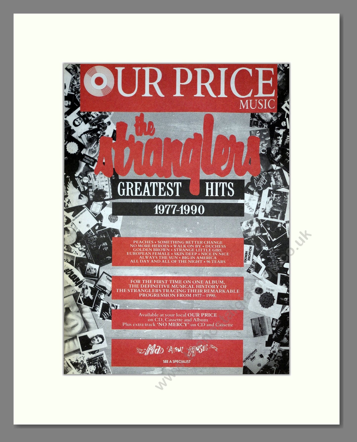 Stranglers (The) - Greatest Hits 77-90. Vintage Advert. This is a large classic original advert from 1990. Presented and supplied in a cream bevel cut mount with backing card and clear bag. Ready to fit in a 20 x 16 inches frame. The mounted advert will be posted via courier and well packed - protected with a sheet of hardboard to keep it rigid. Any questions or enquiries, please get in touch, we are here to help! All our adverts, unless clearly stated are originals from the date shown. They make excellent pieces of wall art and stunning gifts. Many are rare and hard to find and once sold, may not be replaced. Remember you are buying a piece of history. Website watermark is not on original.
