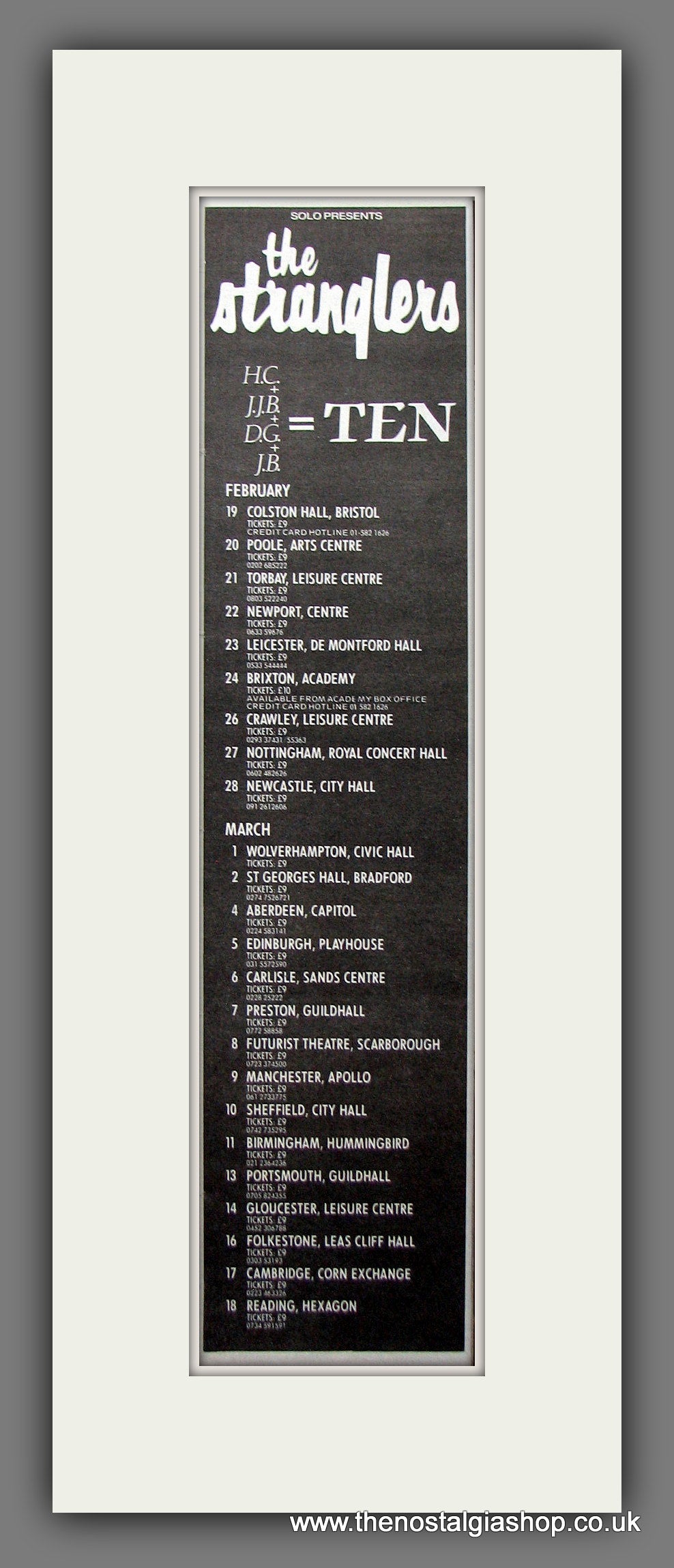 The Stranglers, UK Tour. This is a large Original Vintage Advert 1989. Presented and Supplied in a cream, bevel cut mount with backing card and clear bag. Ready to fit in 20 x 10 inch frame. The mounted advert will be posted via courier and well packed - protected with a sheet of hardboard to keep it rigid. Any questions or inquiries, please get in touch, we are here to help! All our adverts, unless clearly stated are Originals from the date shown. They make excellent pieces of wall art and stunning gifts. Many are rare and hard to find and once sold, may not be replaced. Remember you are buying a piece of history. Website watermark is not on original.