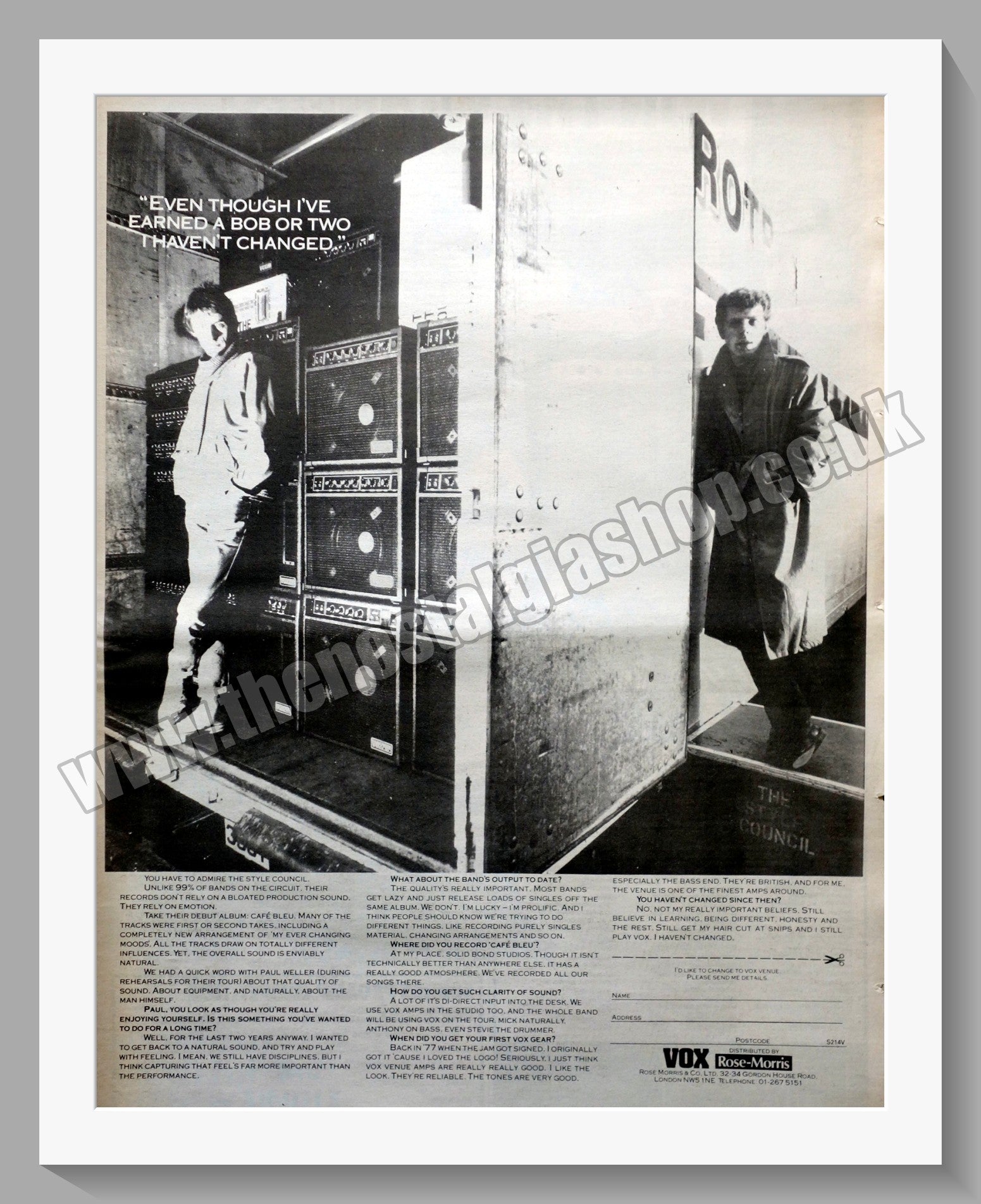 The Style Council Vox Sound System. Vintage Advert. This is a large Original advert 1984. Presented and Supplied in a 20 x 16 Inch, cream bevel cut mount with backing card and clear bag. Ready to frame. The mounted advert will be posted via courier and well packed - protected with a sheet of hardboard to keep it rigid. Any questions or inquiries, please get in touch, we are here to help! All our adverts, unless clearly stated are Originals from the date shown. They make excellent pieces of wall art and stunning gifts. Many are rare and hard to find and once sold, may not be replaced. Remember you are buying a piece of history. Website watermark is not on original.