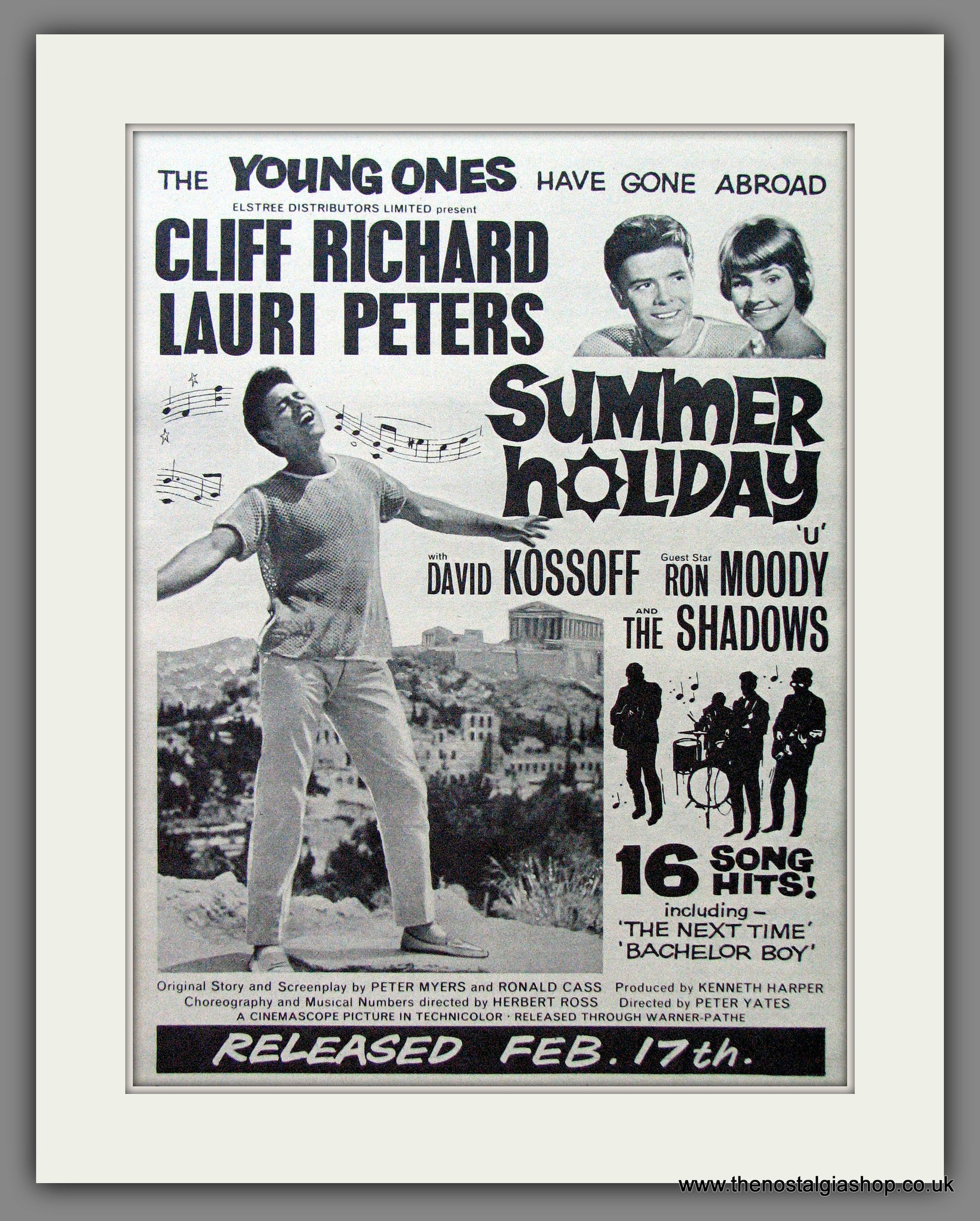 Summer Holiday, Cliff Richard, The Shadows, Lauri Peters. Vintage Advert. Classic Original advert 1963. Presented and Supplied in a cream bevel cut mount with backing card and display bag. Ready to fit in 14 x 11 inch frame. Want it framing? If so, buy this then go to Frames Available Category. Click to buy on the suitable frame and we will do the rest. All our adverts, unless clearly stated are Originals from the date shown. They make excellent pieces of wall art and stunning gifts. Many are rare and hard to find and once sold, may not be replaced. Remember you are buying a piece of history. Website watermark is not on original.