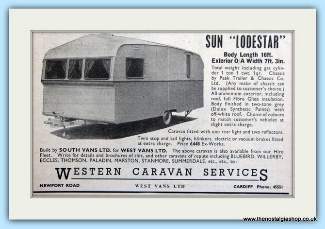 Sun Lodestar Caravan. Western caravan services.Classic original advert 1955. Presented in cream bevel cut mount with backing card and clear bag. Ready to fit in 10 x 8 inch frame. Want it framing? If so, buy this then go to Frames Available Category. Click to buy on the suitable frame and we will do the rest. All our adverts, unless clearly stated are Originals from the date shown They make excellent pieces of wall art and stunning gifts. Many are rare and hard to find and once sold, may not be replaced. Remember you are buying a piece of history. Website watermark is not on original.