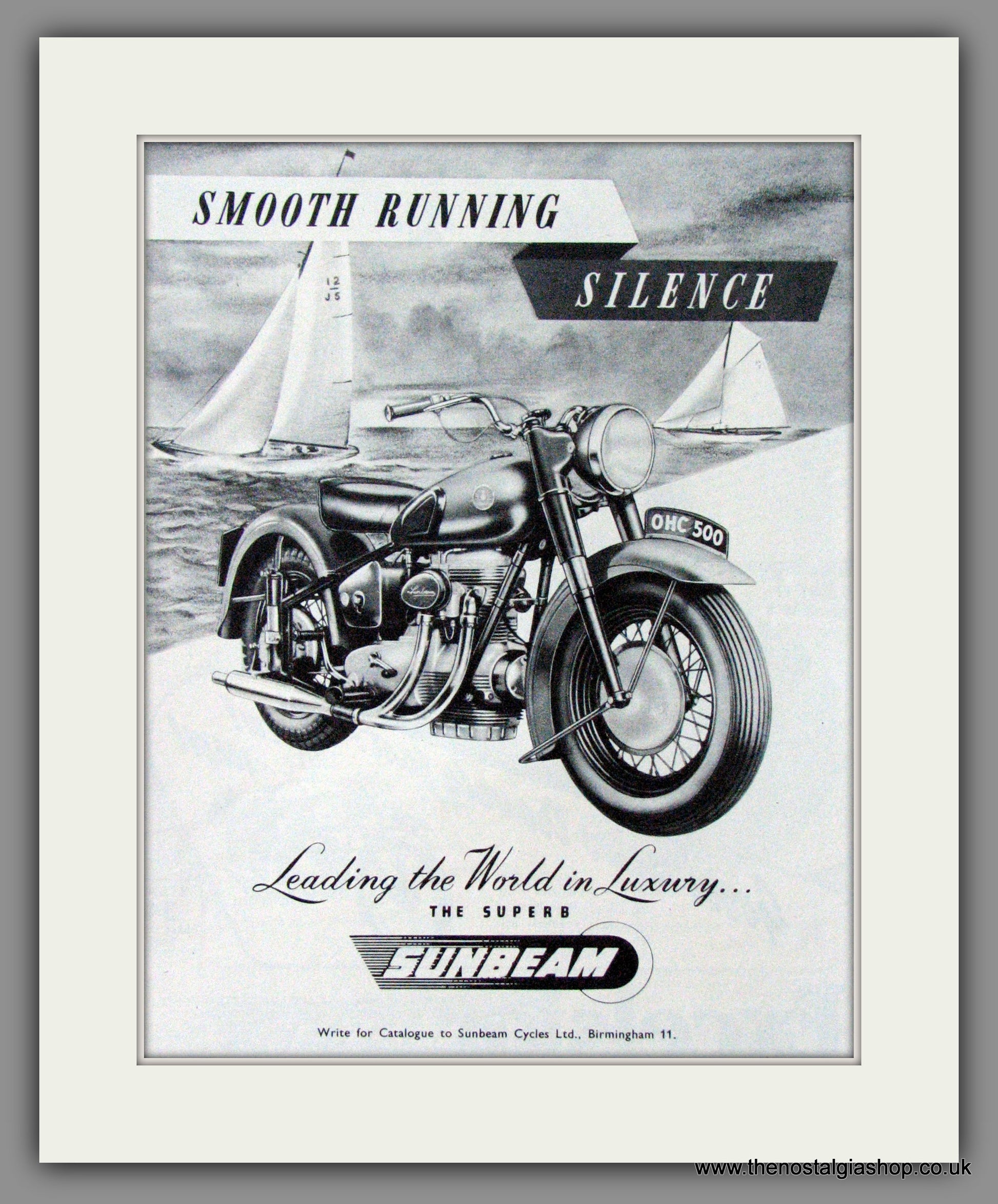 Sunbeam Motorcycle. Sunbeam 500 O.H.C. Classic Original Vintage Advert 1952. Presented in cream bevel cut mount with backing card and clear bag. Ready to fit in 14 x 11 inch frame. Want it framing? If so, buy this then go to Frames Available Category. Click to buy on the suitable frame and we will do the rest. All our adverts, unless clearly stated are Originals from the date shown. They make excellent pieces of wall art and stunning gifts. Many are rare and hard to find and once sold, may not be replaced. Remember you are buying a piece of history. Website watermark is not on original.