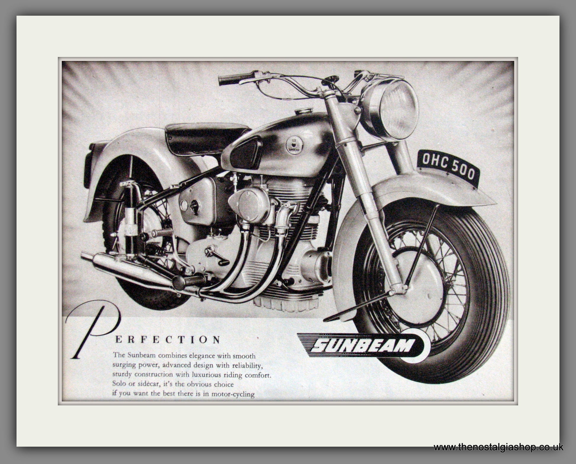 Sunbeam Motorcycles. 500 O.H.C. Classic Original Vintage Advert 1954. Presented in cream bevel cut mount with backing card and clear bag. Ready to fit in 14 x 11 inch frame. Want it framing? If so, buy this then go to Frames Available Category. Click to buy on the suitable frame and we will do the rest. All our adverts, unless clearly stated are Originals from the date shown. They make excellent pieces of wall art and stunning gifts. Many are rare and hard to find and once sold, may not be replaced. Remember you are buying a piece of history. Website watermark is not on original.