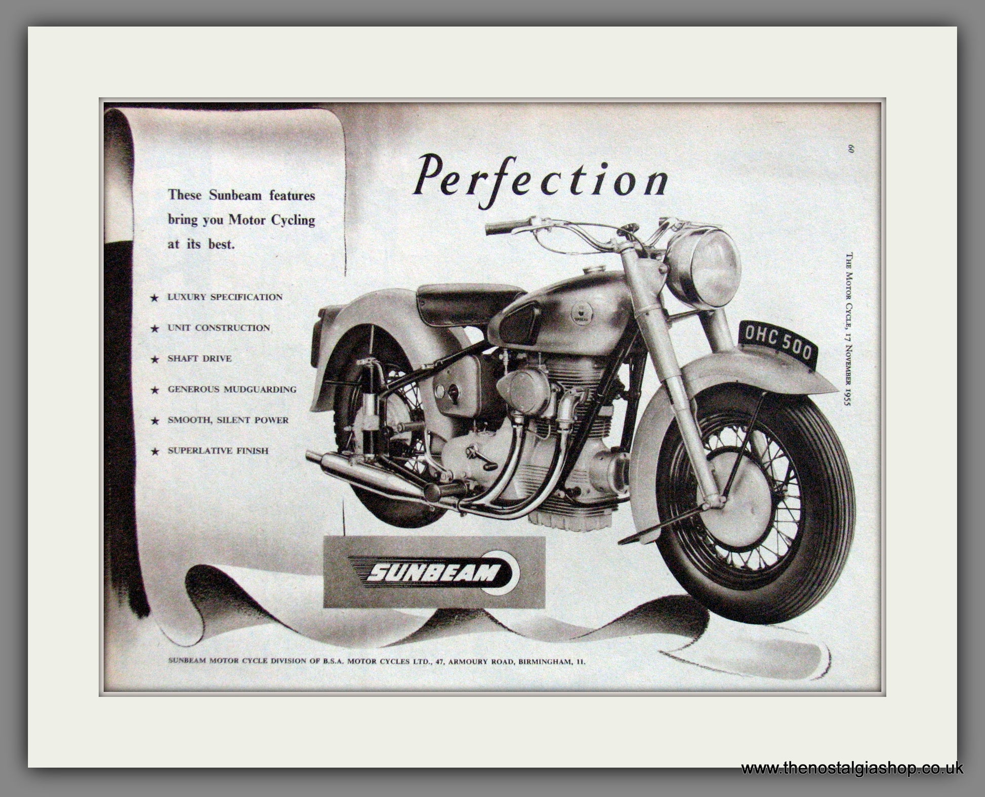 Sunbeam Motorcycles. 500 O.H.C. Classic Original Vintage Advert 1955. Presented in cream bevel cut mount with backing card and clear bag. Ready to fit in 14 x 11 inch frame. Want it framing? If so, buy this then go to Frames Available Category. Click to buy on the suitable frame and we will do the rest. All our adverts, unless clearly stated are Originals from the date shown. They make excellent pieces of wall art and stunning gifts. Many are rare and hard to find and once sold, may not be replaced. Remember you are buying a piece of history. Website watermark is not on original.