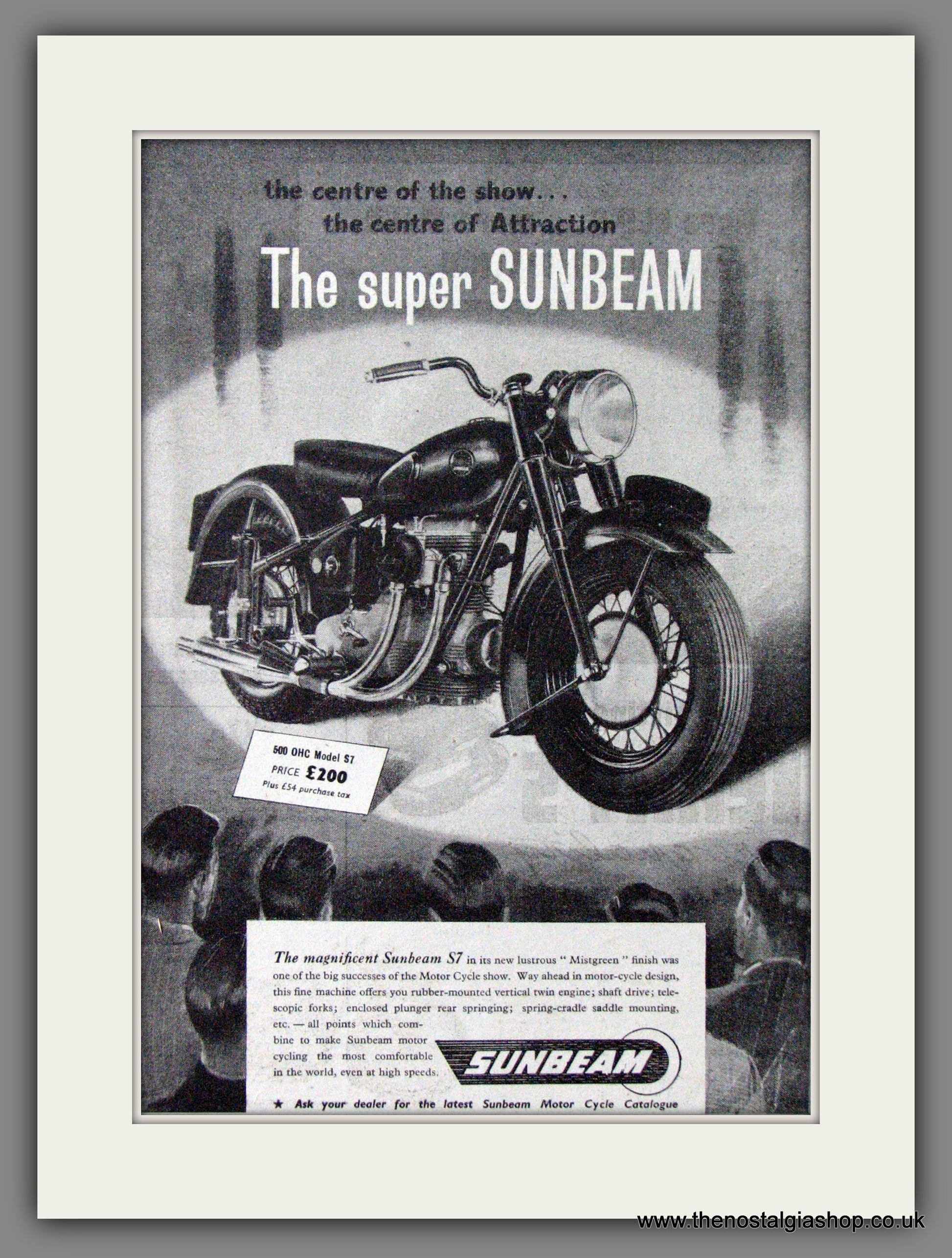 Sunbeam Motorcycles. 500 O.H.C. S7. Classic Original Vintage Advert 1948. Presented in cream bevel cut mount with backing card and clear bag. Ready to fit in 14 x 11 inch frame. Want it framing? If so, buy this then go to Frames Available Category. Click to buy on the suitable frame and we will do the rest. All our adverts, unless clearly stated are Originals from the date shown. They make excellent pieces of wall art and stunning gifts. Many are rare and hard to find and once sold, may not be replaced. Remember you are buying a piece of history. Website watermark is not on original.