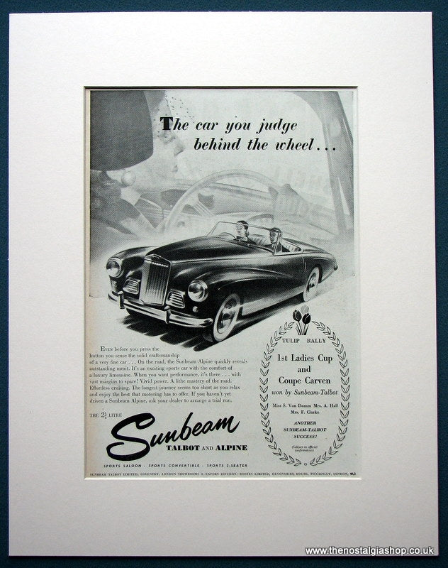 Sunbeam Talbot & Alpine. The car you judge behind the wheel... Classic Original adverts 1954. Presented in cream bevel cut mount with backing card. Each is ready to fit in 14 x 11 inch frame. Want them framing? buy this then go to Frames Available Category. Click to buy on the suitable frame(s) and we will do the rest. All our adverts, unless clearly stated are Originals from the date shown They make excellent pieces of wall art and stunning gifts. Many are rare and hard to find and once sold, may not be replaced. Remember you are buying a piece of history. Website watermark is not on original.