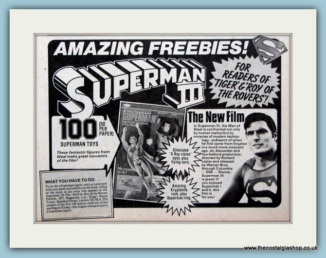 Superman III Freebies. For readers of Tiger & Roy of the Rovers.Classic original advert 1983. Presented in cream bevel cut mount with backing card and clear bag. Ready to fit in 10 x 8 inch frame. All our adverts, unless clearly stated are Originals from the date shown They make excellent pieces of wall art and stunning gifts. Many are rare and hard to find and once sold, may not be replaced. Remember you are buying a piece of history. Website watermark is not on original.