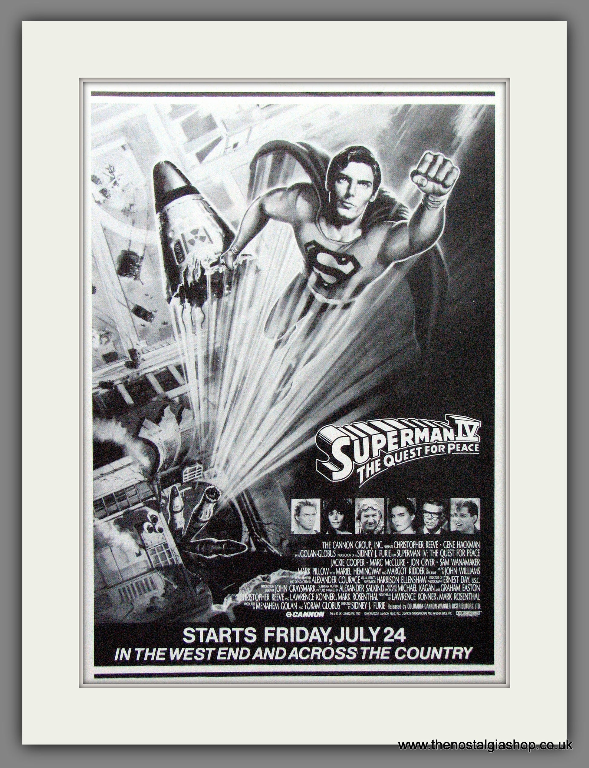 Superman 4 The Quest For Peace. Christopher Reeve, Gene Hackman. Original advert 1987. Presented and Supplied in a cream bevel cut mount with backing card and Clear Bag. Ready to fit in 14 x 11 inch frame. Want it framing? If so, buy this then go to Frames Available Category. Click to buy on the suitable frame and we will do the rest. All our adverts, unless clearly stated are Originals from the date shown. They make excellent pieces of wall art and stunning gifts. Many are rare and hard to find and once sold, may not be replaced. Remember you are buying a piece of history. Note, light crease down left side of advert.