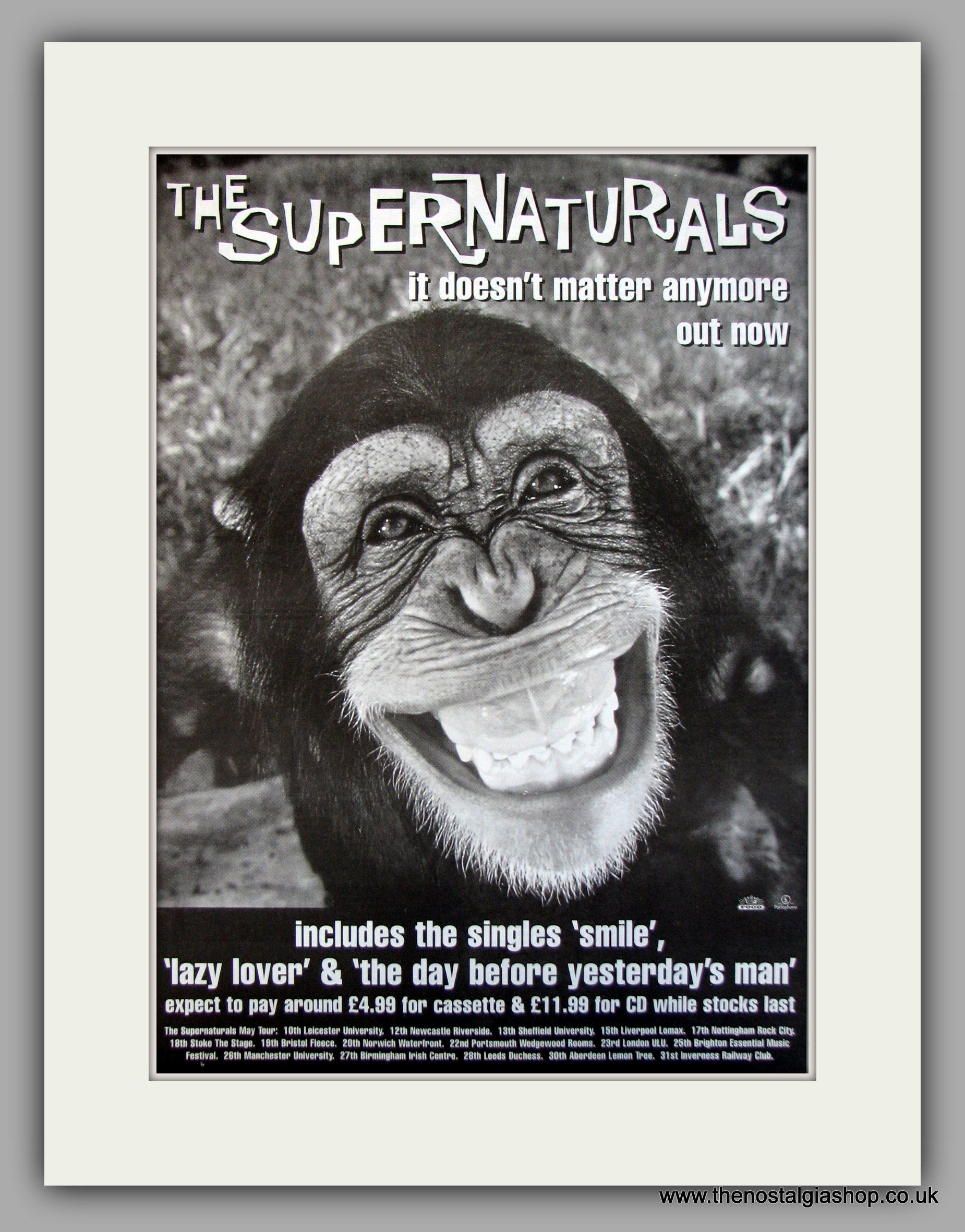 Supernaturals (The) It Doesn't Matter Anymore. Original Vintage Advert 1997 (ref AD10141). Presented and supplied in a cream bevel cut mount with backing card and clear bag. Ready to fit in a 20x16 inch frame. The mounted advert will be posted via courier and well packed - protected with a sheet of hardboard to keep it rigid. Any questions or enquiries, please get in touch, we are here to help! All our adverts, unless clearly stated are originals from the date shown. They make excellent pieces of wall art and stunning gifts. Many are rare and hard to find and once sold, may not be replaced. Remember you are buying a piece of history. Website watermark is not on original.