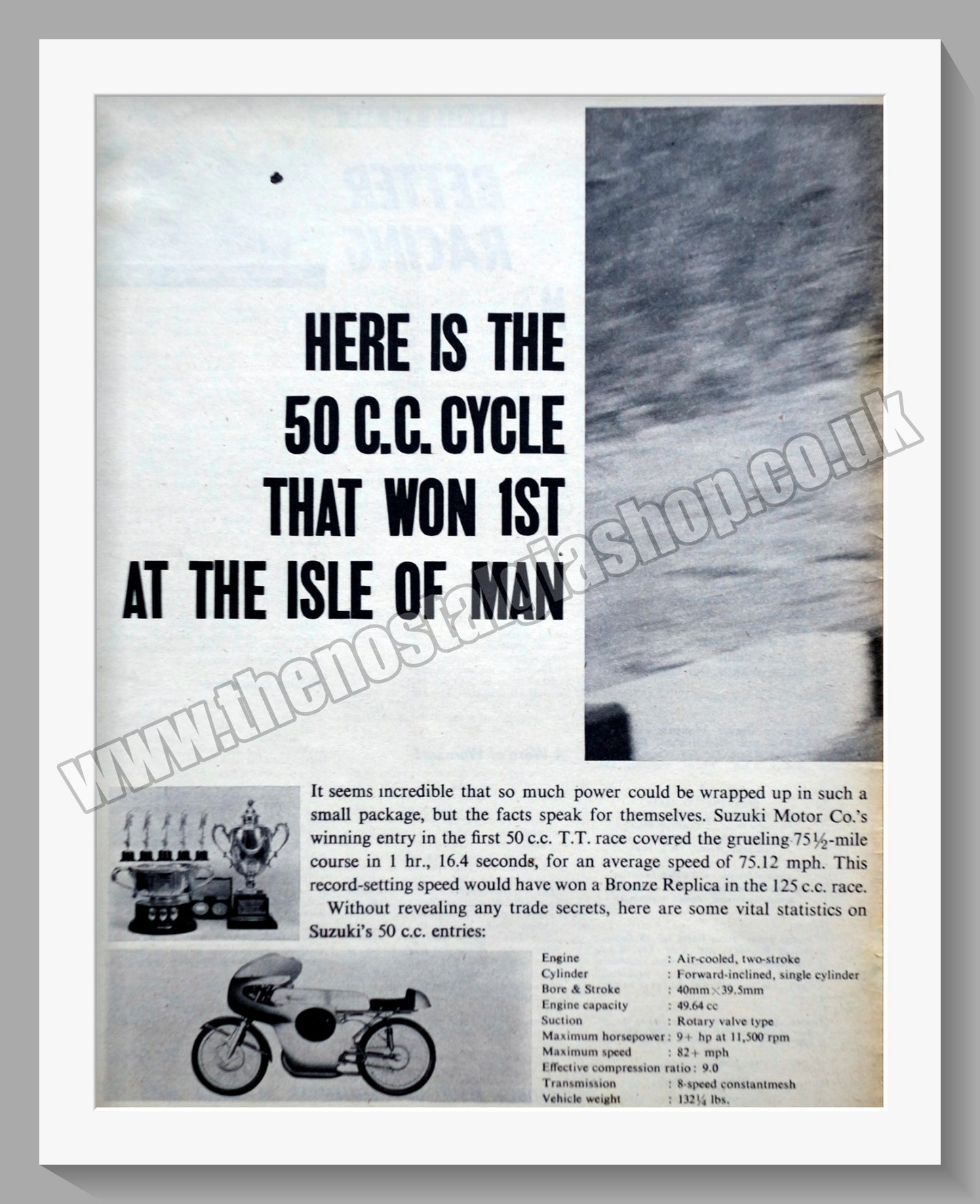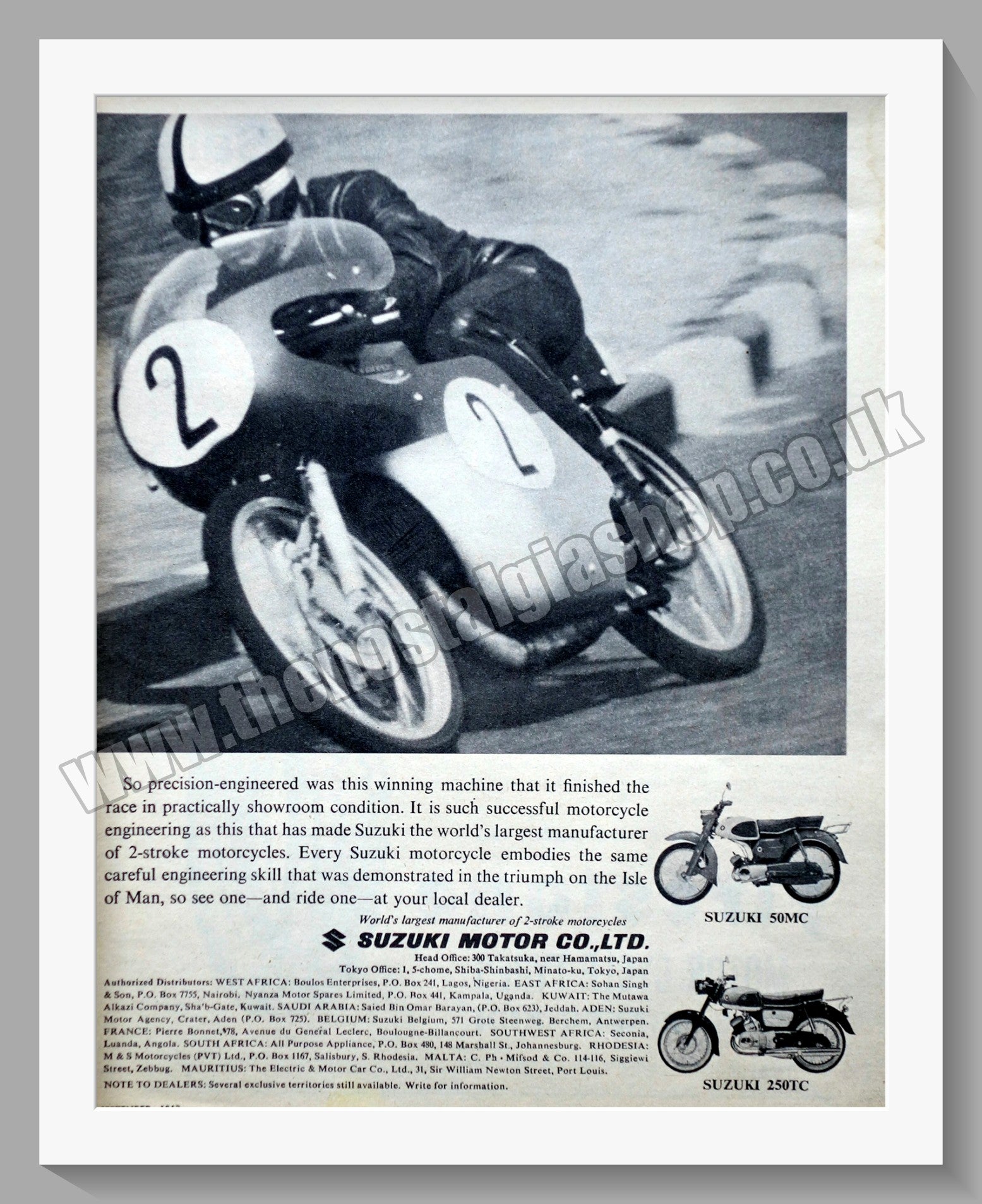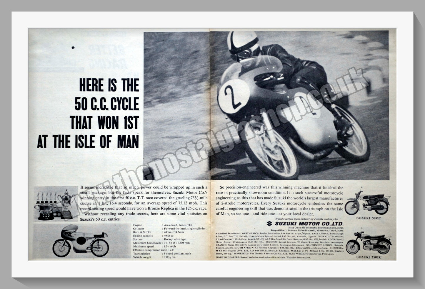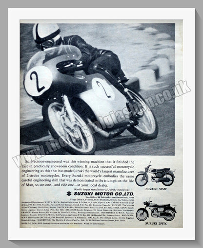 Suzuki. 50MC and 250TC Original Vintage Advert 1962. This Advert is A3 in size, in 2 halves and is Supplied in Two 14 x 11 Inch, cream bevel cut mounts with backing card and clear bag. (NOT ONE MOUNT AS SEEN IN PICTURE) Ready to frame. All our adverts, unless clearly stated are Originals from the date shown. They make excellent pieces of wall art and stunning gifts. Many are rare and hard to find and once sold, may not be replaced. Remember you are buying a piece of history. Website watermark is not on original. Japanese Motorcycles. Suzuki Motorcycles.