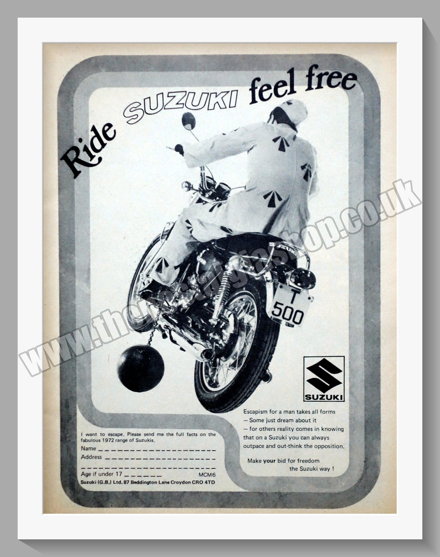 Suzuki. Original Vintage Advert 1972. Presented and Supplied in a 14 x 11 Inch, cream bevel cut mount with backing card and clear bag. Ready to frame. All our adverts, unless clearly stated are Originals from the date shown. They make excellent pieces of wall art and stunning gifts. Many are rare and hard to find and once sold, may not be replaced. Remember you are buying a piece of history. Website watermark is not on original. Japanese Motorcycles. Suzuki Motorcycles.