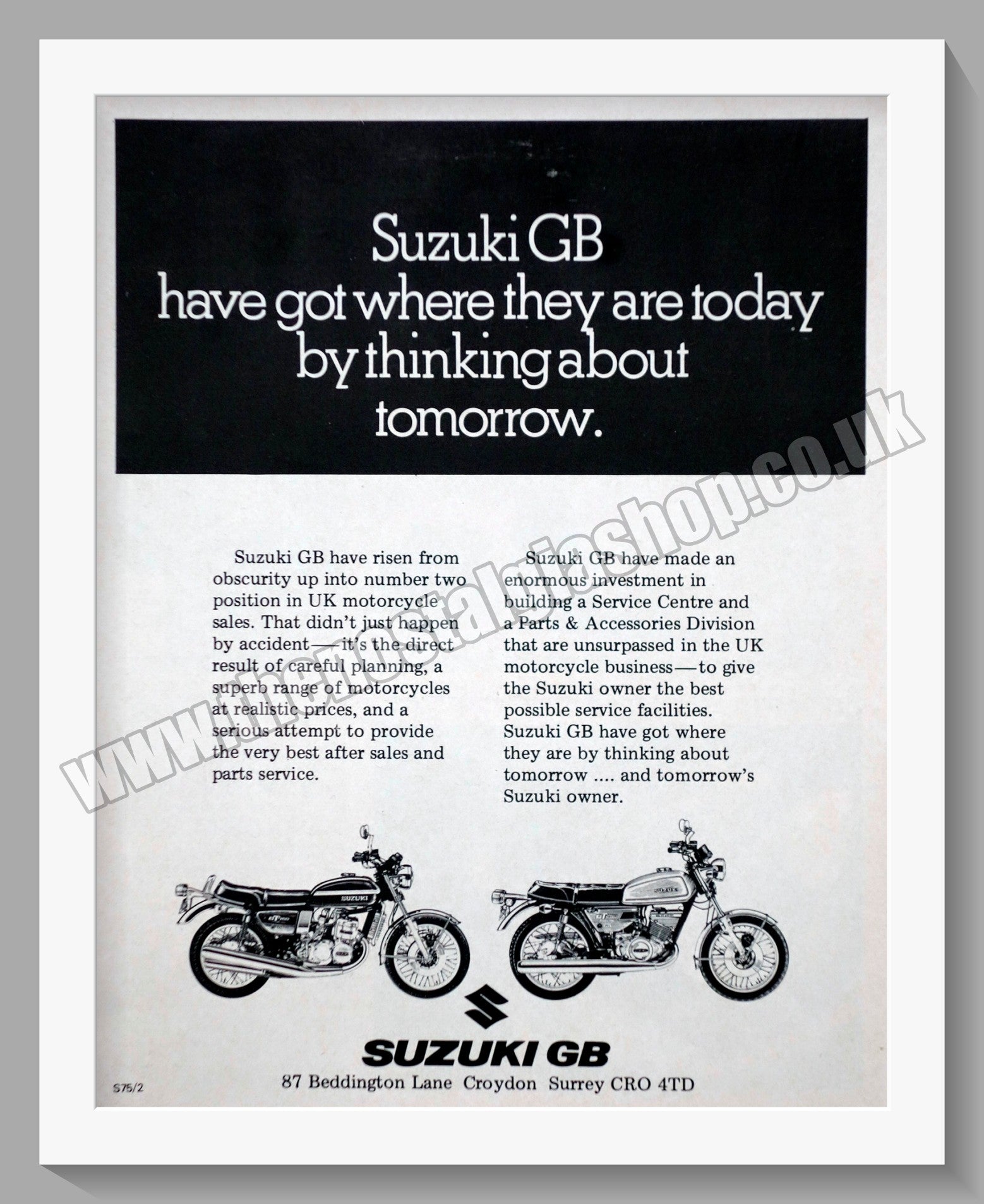 Suzuki GB. Original Vintage Advert 1975. Presented and Supplied in a 14 x 11 Inch, cream bevel cut mount with backing card and clear bag. Ready to frame. All our adverts, unless clearly stated are Originals from the date shown. They make excellent pieces of wall art and stunning gifts. Many are rare and hard to find and once sold, may not be replaced. Remember you are buying a piece of history. Website watermark is not on original. Japanese Motorcycles. Suzuki Motorcycles.