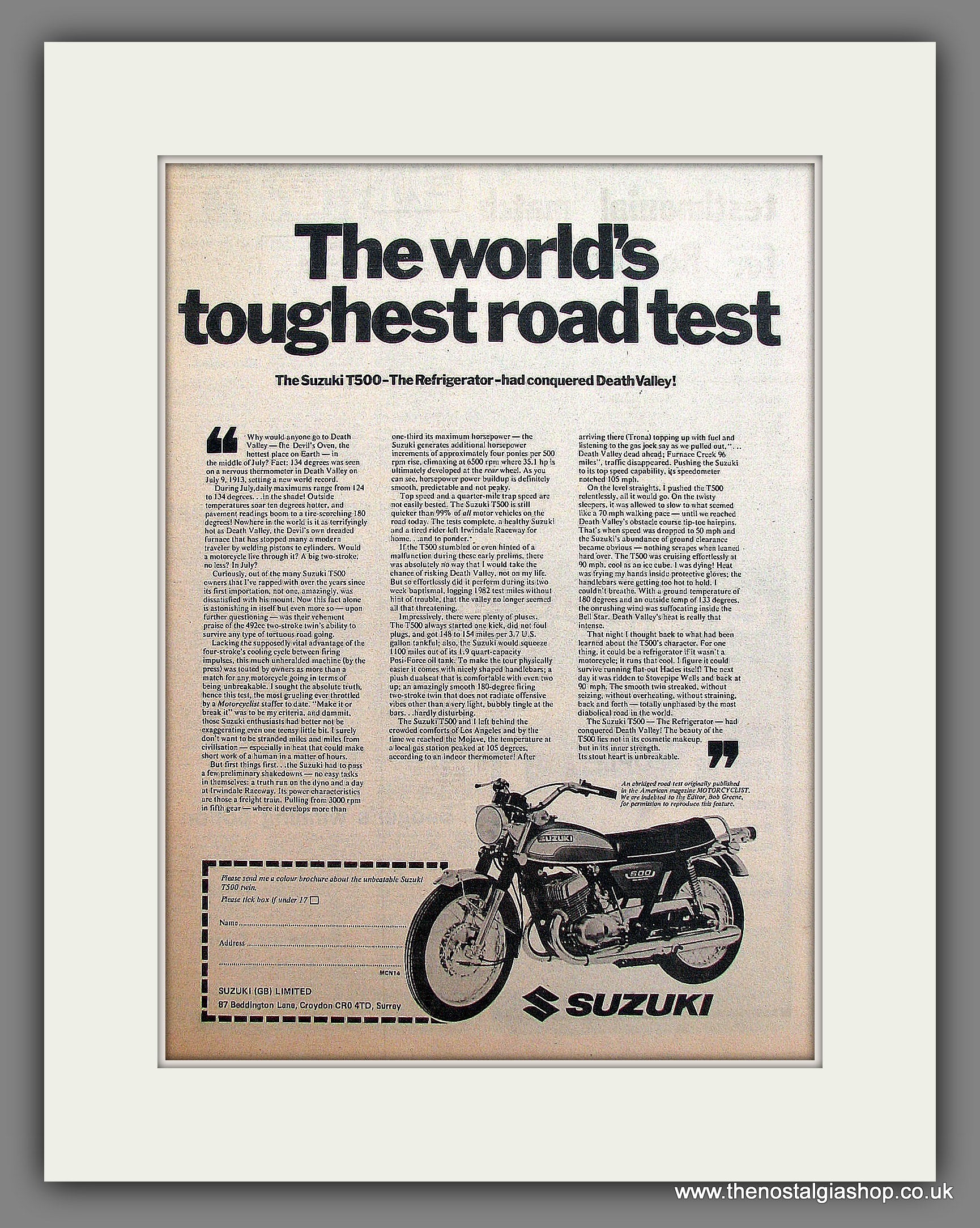 Suzuki T500 Motorcycle. Original Advert 1974 (ref AD12927). Presented and supplied in a cream bevel cut mount with backing card and clear bag. Ready to fit in a 20x16 inch frame. The mounted advert will be posted via courier and well packed - protected with a sheet of hardboard to keep it rigid. Any questions or enquiries, please get in touch, we are here to help! All our adverts, unless clearly stated are originals from the date shown. They make excellent pieces of wall art and stunning gifts. Many are rare and hard to find and once sold, may not be replaced. Remember you are buying a piece of history. Website watermark is not on original.