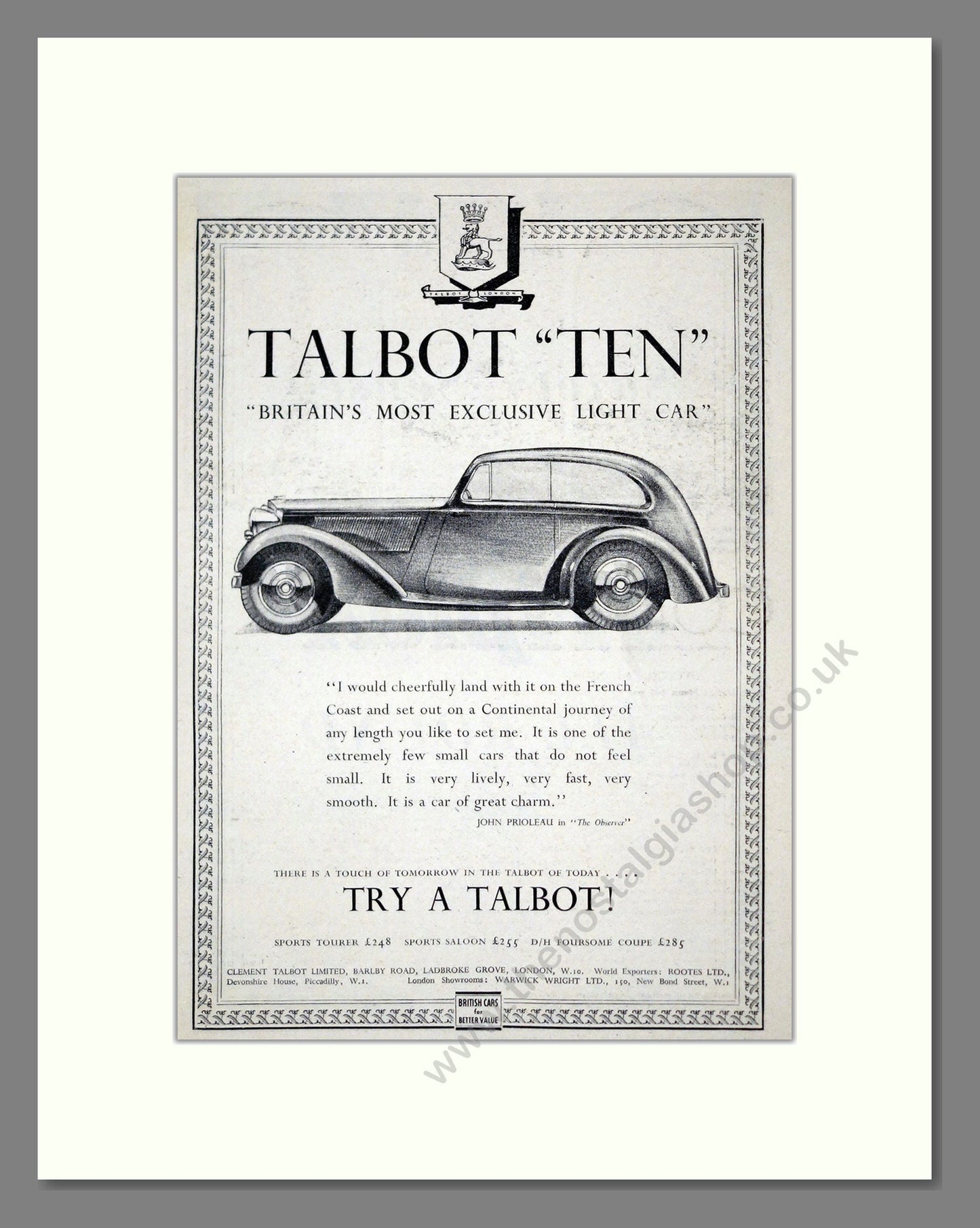 Talbot - Ten. Vintage Advert. This is a classic original advert from 1938. Presented and supplied in a cream bevel cut mount with backing card and clear bag. Ready to fit in a 14 x 11 inches frame. The mounted advert will be posted via courier and well packed - protected with a sheet of hardboard to keep it rigid. Any questions or enquiries, please get in touch, we are here to help! All our adverts, unless clearly stated are originals from the date shown. They make excellent pieces of wall art and stunning gifts. Many are rare and hard to find and once sold, may not be replaced. Remember you are buying a piece of history. Website watermark is not on original.