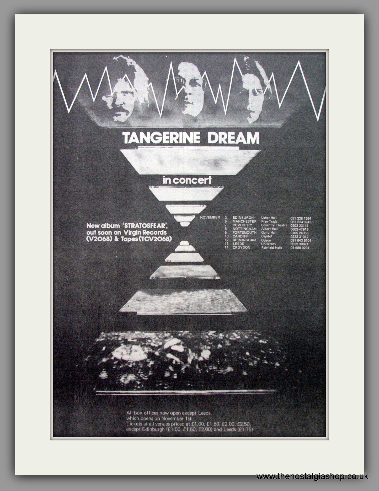 Tangerine Dream in Concert UK Tour, Also new Album Stratosfear. Vintage Advert. This is a large classic Original advert 1976. Presented in cream bevel cut mount with backing card and clear bag. Ready to fit in 20 x 16 inch frame. The mounted advert will be posted via courier and well packed - protected with a sheet of hardboard to keep it rigid. Any questions or inquiries, please get in touch, we are here to help! All our adverts, unless clearly stated are Originals from the date shown. They make excellent pieces of wall art and stunning gifts. Many are rare and hard to find and once sold, may not be replaced. Remember you are buying a piece of history. Website watermark is not on original .