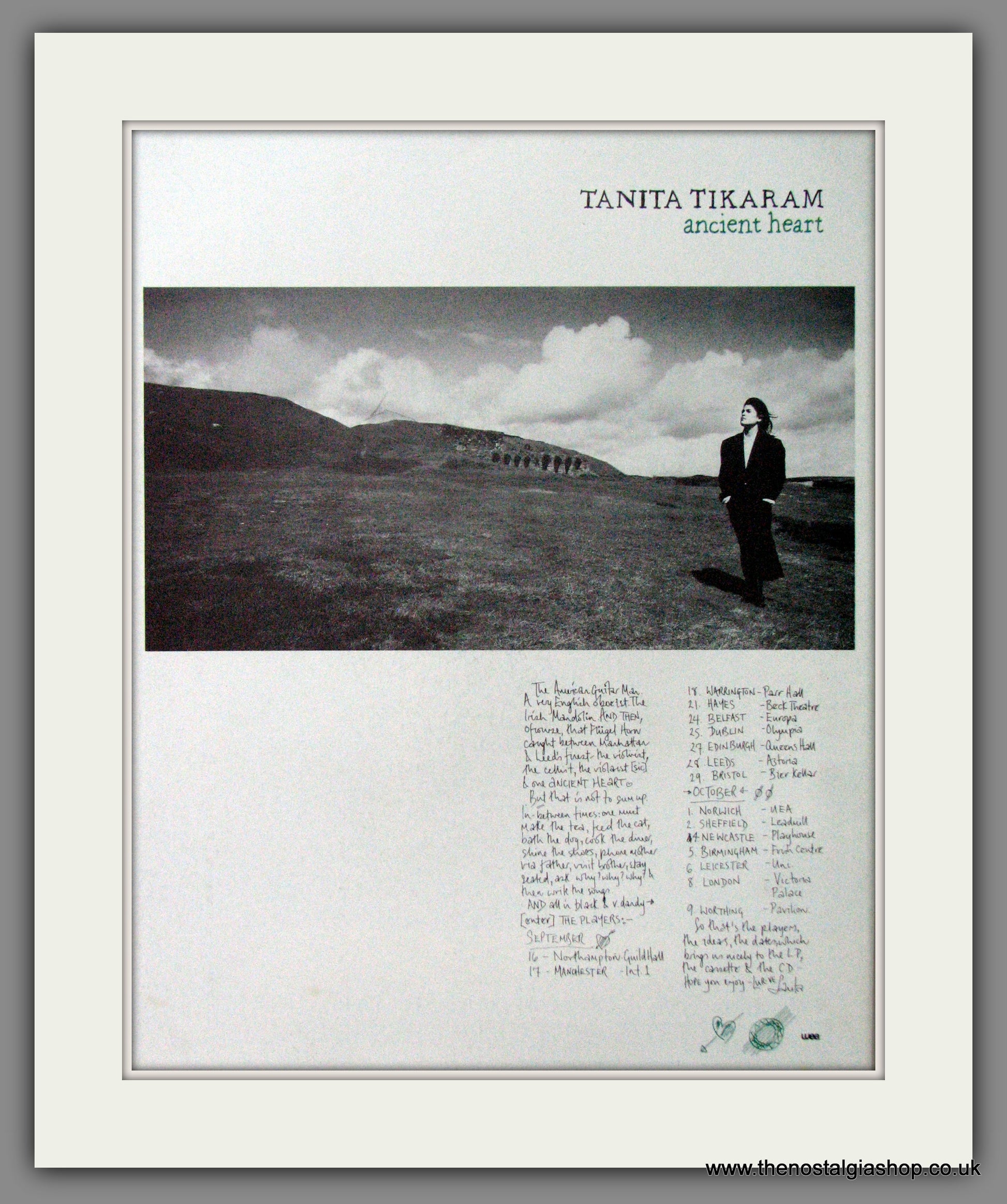 Tanita Tikaram, Ancient Heart. Classic original advert 1988. Presented and Supplied in cream bevel cut mount with backing card and clear bag. Ready to fit in 14 x 11 inch frame. Want it framing? If so, buy this then go to Frames Available Category. Click to buy on the suitable frame and we will do the rest. All our adverts, unless clearly stated are Originals from the date shown. They make excellent pieces of wall art and stunning gifts. Many are rare and hard to find and once sold, may not be replaced. Remember you are buying a piece of history. Website watermark is not on original.