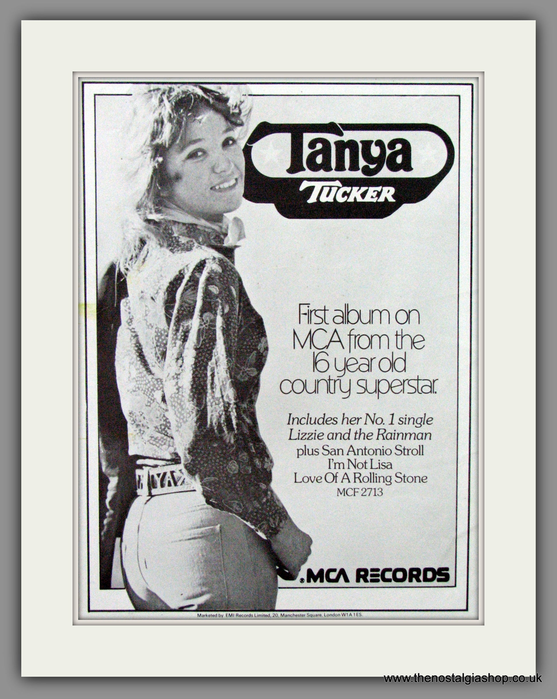 Tanya Tucker. Classic original advert 1975. Presented and Supplied in cream bevel cut mount with backing card and clear bag. Ready to fit in 14 x 11 inch frame. Want it framing? If so, buy this then go to Frames Available Category. Click to buy on the suitable frame and we will do the rest. All our adverts, unless clearly stated are Originals from the date shown. They make excellent pieces of wall art and stunning gifts. Many are rare and hard to find and once sold, may not be replaced. Remember you are buying a piece of history. Website watermark is not on original.