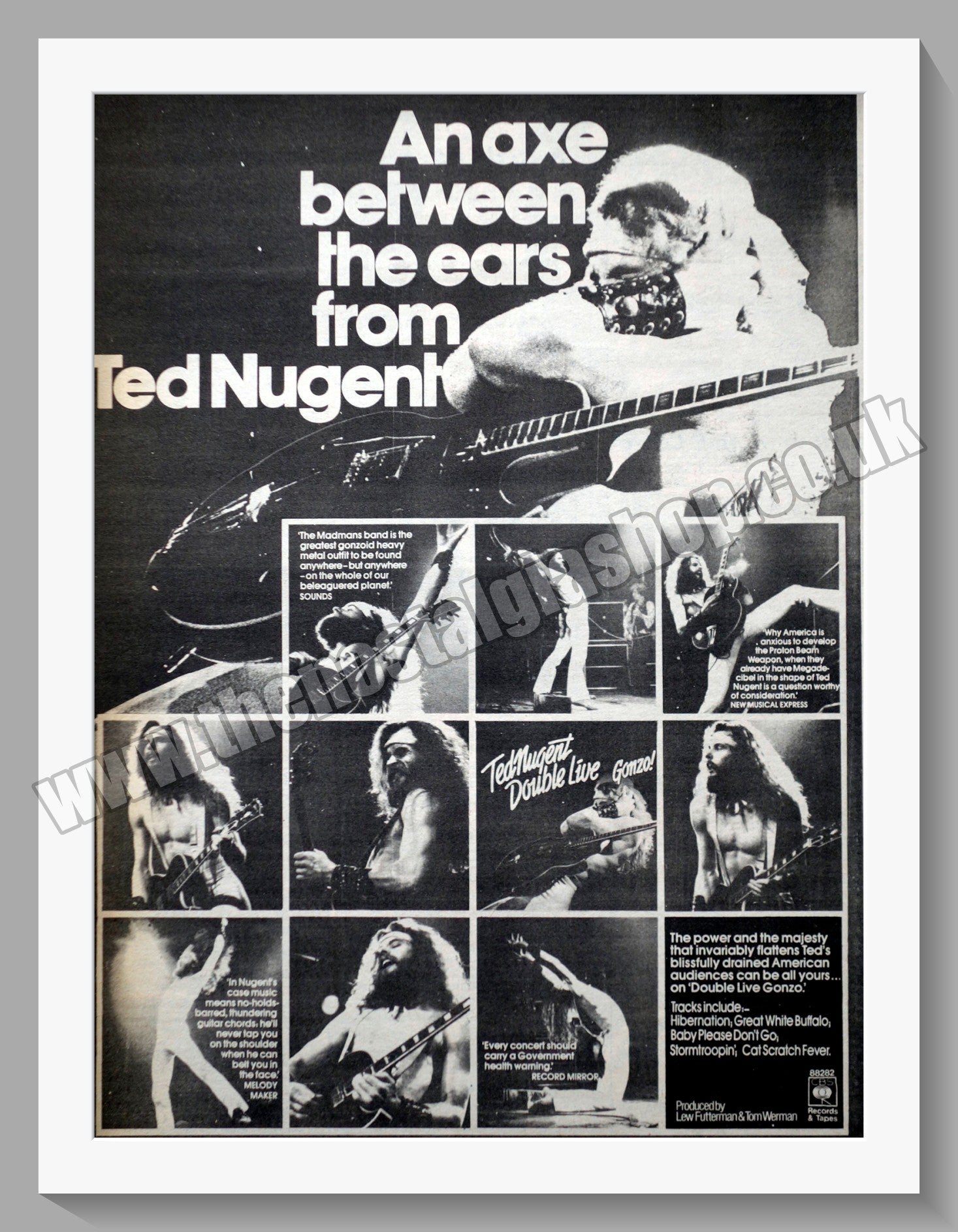 Ted Nugent. Double Live. This is a large classic Original advert 1978. Presented and Supplied in a cream bevel cut mount with backing card and clear bag. Ready to fit in 20 x 16 inch frame. The mounted advert will be posted via courier and well packed - protected with a sheet of hardboard to keep it rigid. Any questions or enquiries, please get in touch, we are here to help! All our adverts, unless clearly stated are Originals from the date shown. They make excellent pieces of wall art and stunning gifts. Many are rare and hard to find and once sold, may not be replaced. Remember you are buying a piece of history. Website watermark is not on original .
