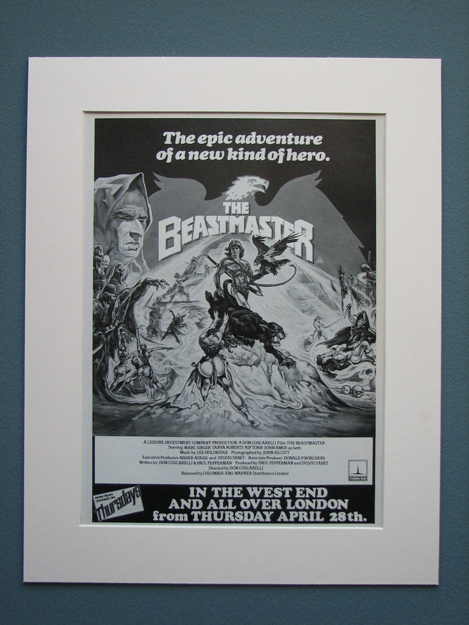 The Beastmaster & Movie poster advert Marc Singer, Tanya Roberts, Rip Torn. Original advert 1983 + Unmounted Movie Poster advert in colour Professionally sealed and presented in cream bevel cut mount with backing card. Ready to fit in 14 x 11 inch frame. Want it framing? buy this then go to Frames Available Catagory. Click to buy on the suitable frame and we will do the rest. All our adverts, unless clearly stated are Originals from the date shown They make excellent pieces of wall art and stunning gifts. Many are rare and hard to find and once sold, may not be replaced. Remember you are buying a piece of history.
