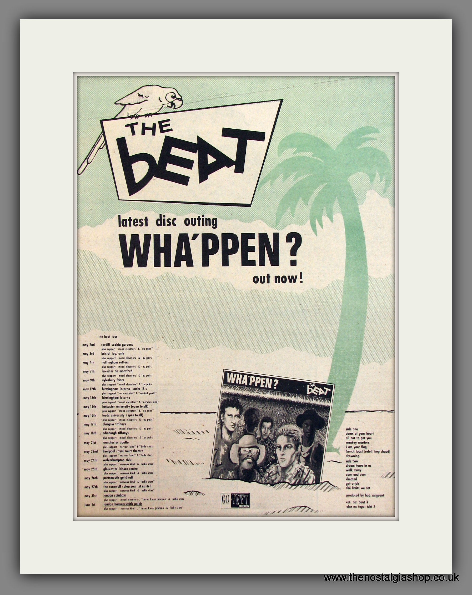 The Beat, Wha'ppen. Original Advert 1981 (ref AD11751). Presented and supplied in a cream bevel cut mount with backing card and clear bag. Ready to fit in a 20x16 inch frame. The mounted advert will be posted via courier and well packed - protected with a sheet of hardboard to keep it rigid. Any questions or enquiries, please get in touch, we are here to help! All our adverts, unless clearly stated are originals from the date shown. They make excellent pieces of wall art and stunning gifts. Many are rare and hard to find and once sold, may not be replaced. Remember you are buying a piece of history. Website watermark is not on original.