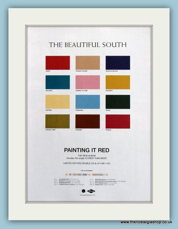 The Beautiful South Painting It Red The New Album. Classic original advert 2000 Presented in cream bevel cut mount with backing card. Ready to fit in 14 x 11 inch frame. Want it framing? buy this then go to Frames Available Category. Click to buy on the suitable frame(s) and we will do the rest. All our adverts, unless clearly stated are Originals from the date shown. They make excellent pieces of wall art and stunning gifts. Many are rare and hard to find and once sold, may not be replaced. Remember you are buying a piece of history.