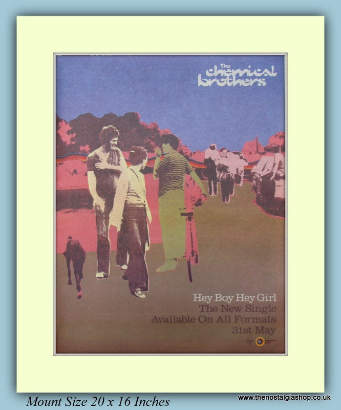 Chemical Brothers Hey Boy Hey Girl Original Advert 1999 (ref AD9151). Presented and supplied in a cream bevel cut mount with backing card and clear bag. Ready to fit in a 20x16 inch frame. The mounted advert will be posted via courier and well packed - protected with a sheet of hardboard to keep it rigid. Any questions or enquiries, please get in touch, we are here to help! All our adverts, unless clearly stated are originals from the date shown. They make excellent pieces of wall art and stunning gifts. Many are rare and hard to find and once sold, may not be replaced. Remember you are buying a piece of history. Website watermark is not on original.