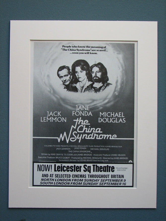 The China Syndrome. Jack Lemon, Jane Fonda, Michael Douglas. Original advert 1979. Presented in cream bevel cut mount with backing card. Ready to fit in 14 x 11 inch frame. Want it framing? buy this then go to Frames Available Category. Click to buy on the suitable frame and we will do the rest. All our adverts, unless clearly stated are Originals from the date shown They make excellent pieces of wall art and stunning gifts. Many are rare and hard to find and once sold, may not be replaced. Remember you are buying a piece of history.