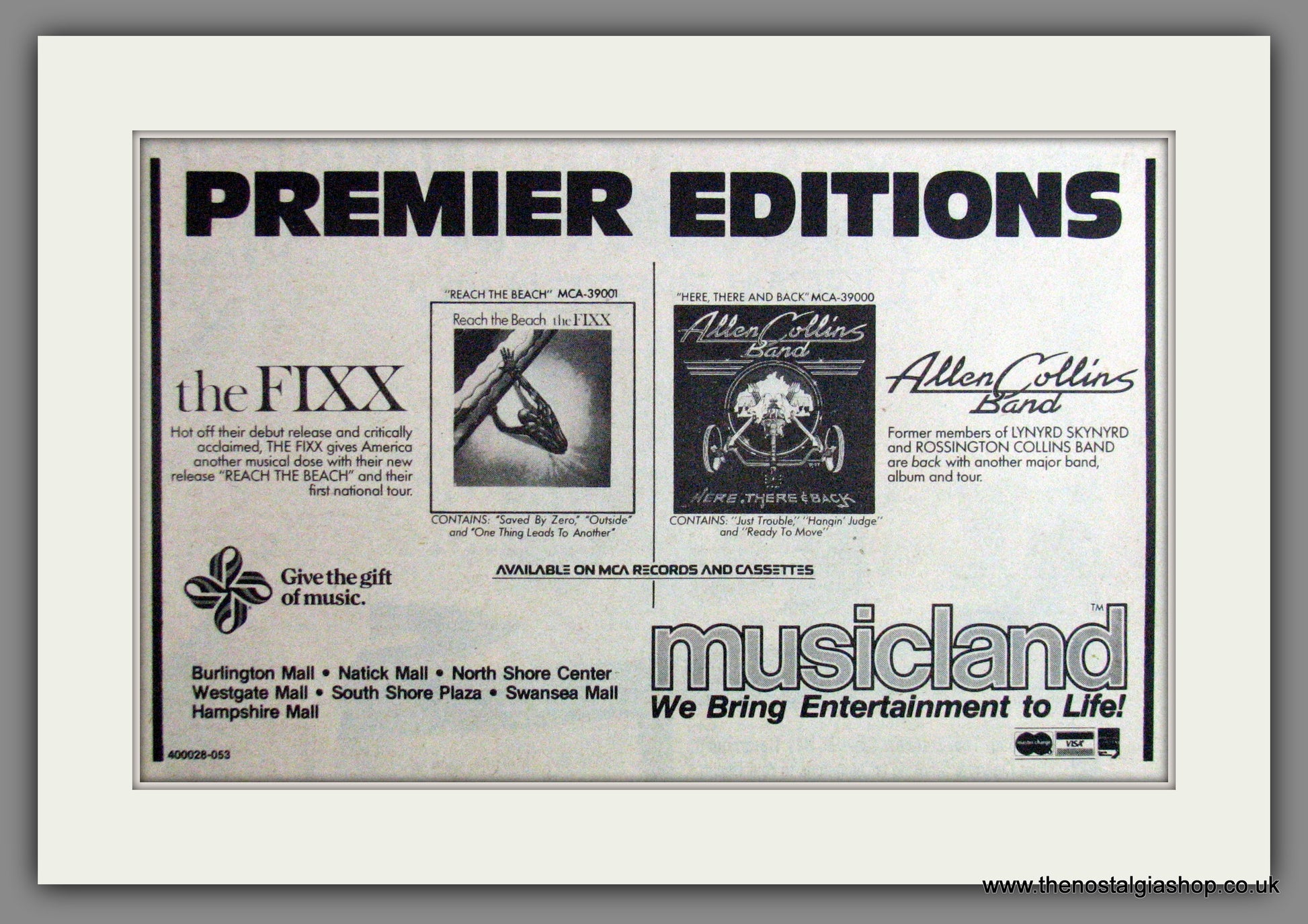 The Fixx & Allen Collins Band. Musicland, Premier Editions. Classic original advert 1983. Presented and Supplied in cream bevel cut mount with backing card and clear bag. Ready to fit in 14 x 11 inch frame. Want it framing? If so, buy this then go to Frames Available Category. Click to buy on the suitable frame and we will do the rest. All our adverts, unless clearly stated are Originals from the date shown. They make excellent pieces of wall art and stunning gifts. Many are rare and hard to find and once sold, may not be replaced. Remember you are buying a piece of history. Website watermark is not on original.