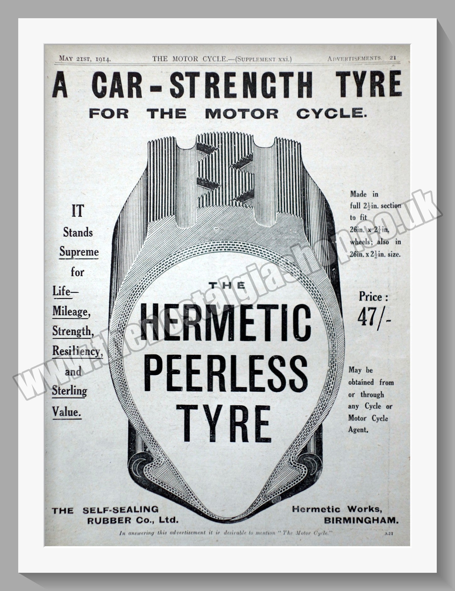 The Hermetic Peerless Motor Cycle Tyre. The Self-Sealing Rubber Co. Ltd Original Vintage Advert 1914. Presented and Supplied in a 14 x 11 Inch, cream bevel cut mount with backing card and clear bag. Ready to frame. All our adverts, unless clearly stated are Originals from the date shown They make excellent pieces of wall art and stunning gifts. Many are rare and hard to find and once sold, may not be replaced. Remember you are buying a piece of history. Website watermark is not on original. Vintage Motorcycle Tyres, Old Motorcycle Tyres.