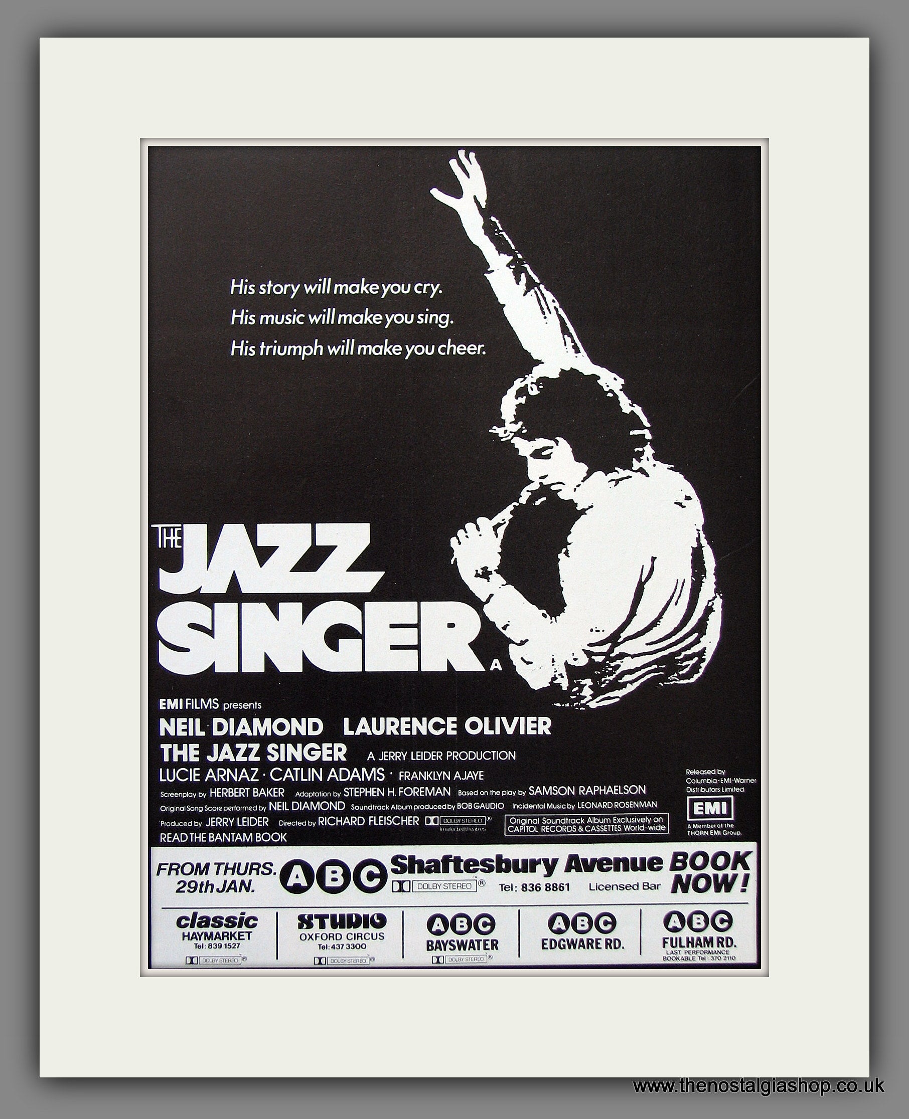 The Jazz Singer. 1981 Classic Original Advert. Presented and supplied in a cream bevel cut mount with backing card and clear bag. Ready to fit in 14 x 11 inch frame. Want it framing? If so, buy this then go to Frames Available Category. Click to buy on the suitable frame and we will do the rest. All our adverts, unless clearly stated are Originals from the date shown. They make excellent pieces of wall art and stunning gifts. Many are rare and hard to find and once sold, may not be replaced. Remember you are buying a piece of history. Website watermark is not on original.