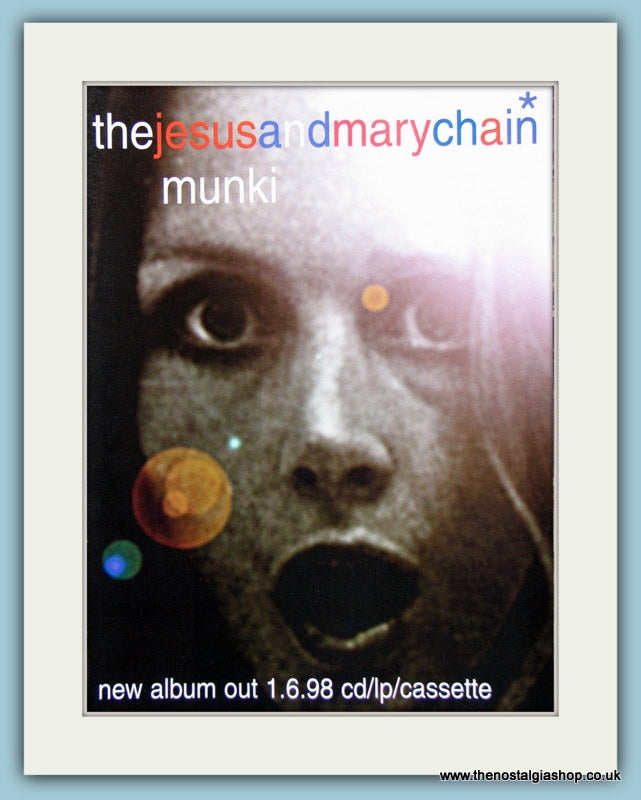 The Jesus And Mary Chain . Munki. Classic original advert 1998. Presented in cream bevel cut mount with backing card and clear bag. Ready to fit in 14 x 11 inch frame. Want it framing? If so, buy this then go to Frames Available Catagory. Click to buy on the suitable frame and we will do the rest. All our adverts, unless clearly stated are Originals from the date shown. They make excellent pieces of wall art and stunning gifts. Many are rare and hard to find and once sold, may not be replaced. Remember you are buying a piece of history. Website watermark is not on original.
