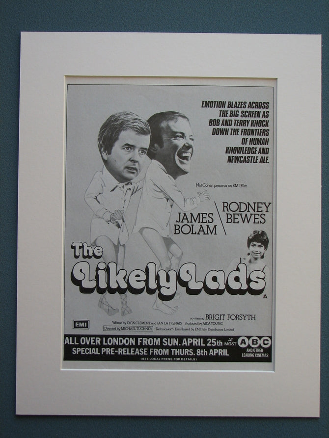 The Likely Lads. James Bolam, Rodney Bewes, Brigit Forsyth. Classic original advert 1976. Presented in cream bevel cut mount with backing card. Ready to fit in 14 x 11 inch frame. Want it framing? If so, buy this then go to Frames Available Category. Click to buy on the suitable frame and we will do the rest. All our adverts, unless clearly stated are Originals from the date shown. They make excellent pieces of wall art and stunning gifts. Many are rare and hard to find and once sold, may not be replaced. Remember you are buying a piece of history.