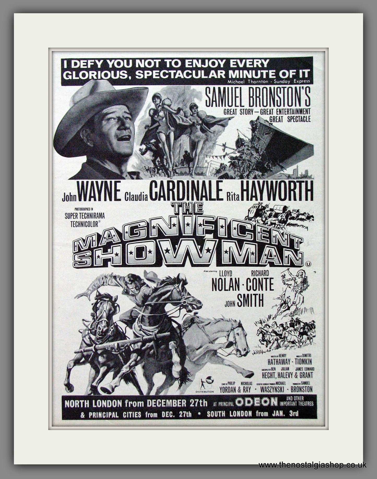 The Magnificent Showman, John Wayne, Claudia Cardinale, Rita Hayworth. Classic Original advert 1965. Presented and Supplied in a cream bevel cut mount with backing card and clear bag. Ready to fit in 14 x 11 inch frame. Want it framing? If so, buy this then go to Frames Available Category. Click to buy on the suitable frame and we will do the rest. All our adverts, unless clearly stated are Originals from the date shown. They make excellent pieces of wall art and stunning gifts. Many are rare and hard to find and once sold, may not be replaced. Remember you are buying a piece of history. Website watermark is not on original.