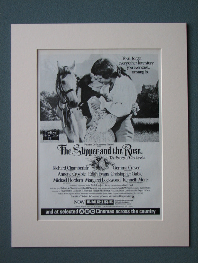 The Slipper and the Rose (Cinderella) Richard Chamberlain, Annette Crosbie, Gemma Craven. Original advert 1976 Presented and Supplied in a cream bevel cut mount with backing card and clear bag. Ready to fit in 14 x 11 inch frame. Want it framing? If so, buy this then go to Frames Available Category. Click to buy on the suitable frame and we will do the rest. All our adverts, unless clearly stated are Originals from the date shown They make excellent pieces of wall art and stunning gifts. Many are rare and hard to find and once sold, may not be replaced. Remember you are buying a piece of history.