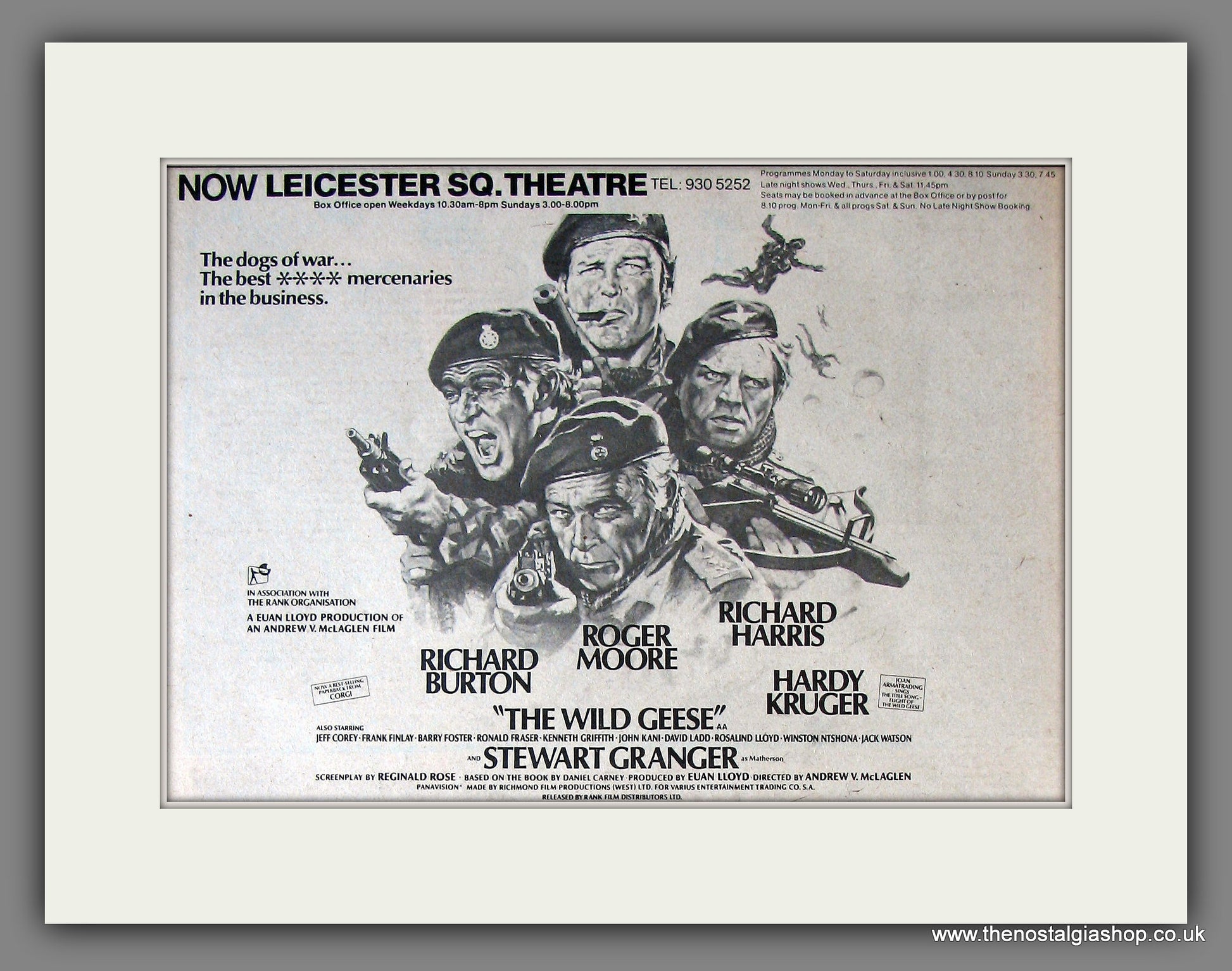 The Wild Geese. This is a classic Original Vintage Advert 1978. Presented and Supplied in a cream, bevel cut mount with backing card and clear bag. Ready to fit in 14 x 11 inch frame. The mounted advert will be posted via courier and well packed - protected with a sheet of hardboard to keep it rigid. Any questions or inquiries, please get in touch, we are here to help! All our adverts, unless clearly stated are Originals from the date shown. They make excellent pieces of wall art and stunning gifts. Many are rare and hard to find and once sold, may not be replaced. Remember you are buying a piece of history. Website watermark is not on original.