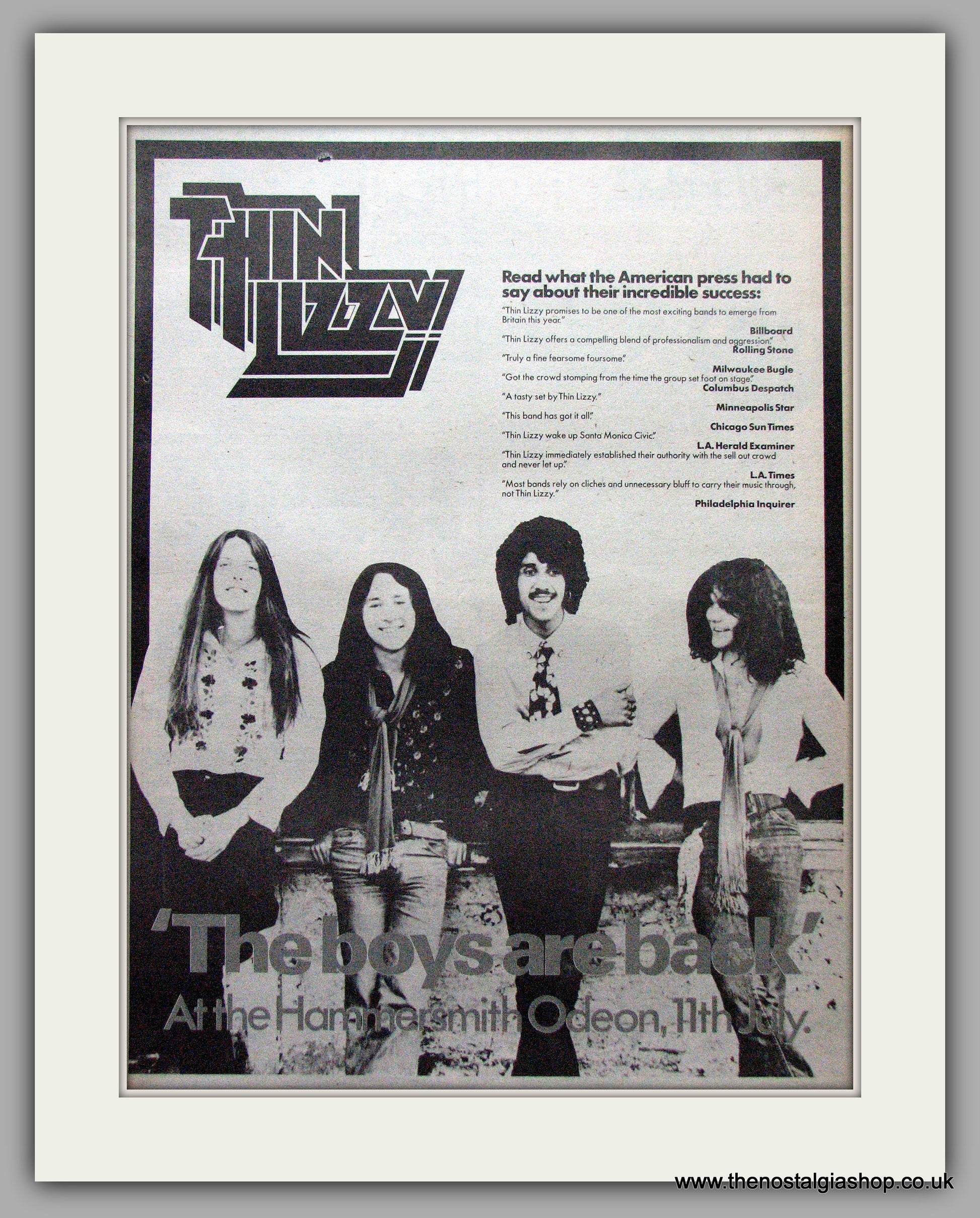 Thin Lizzy at the Hammersmith Odeon. Original Advert 1976 (ref AD9511). Presented and supplied in a cream bevel cut mount with backing card and clear bag. Ready to fit in a 20x16 inch frame. The mounted advert will be posted via courier and well packed - protected with a sheet of hardboard to keep it rigid. Any questions or enquiries, please get in touch, we are here to help! All our adverts, unless clearly stated are originals from the date shown. They make excellent pieces of wall art and stunning gifts. Many are rare and hard to find and once sold, may not be replaced. Remember you are buying a piece of history. Website watermark is not on original.