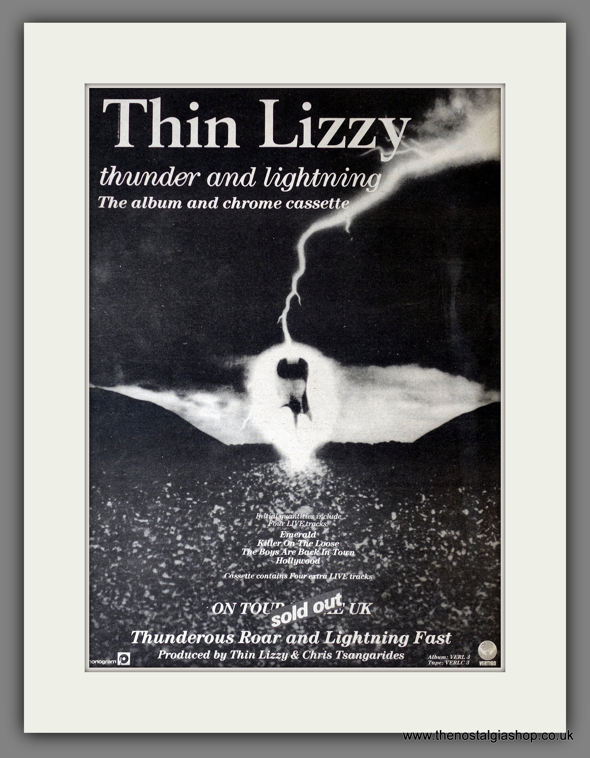 Thin Lizzy. Thunder And Lightning. This is a large classic Original advert 1983. Presented in cream bevel cut mount with backing card and clear bag. Ready to fit in 20 x 16 inch frame. The mounted advert will be posted via courier and well packed - protected with a sheet of hardboard to keep it rigid. Any questions or enquiries, please get in touch, we are here to help! All our adverts, unless clearly stated are Originals from the date shown. They make excellent pieces of wall art and stunning gifts. Many are rare and hard to find and once sold, may not be replaced. Remember you are buying a piece of history. Website watermark is not on original. Phil Lynott. Gary Moore, Scott Gorham, Brian Robertson, Eric Bell, Brian Downey, John Sykes.