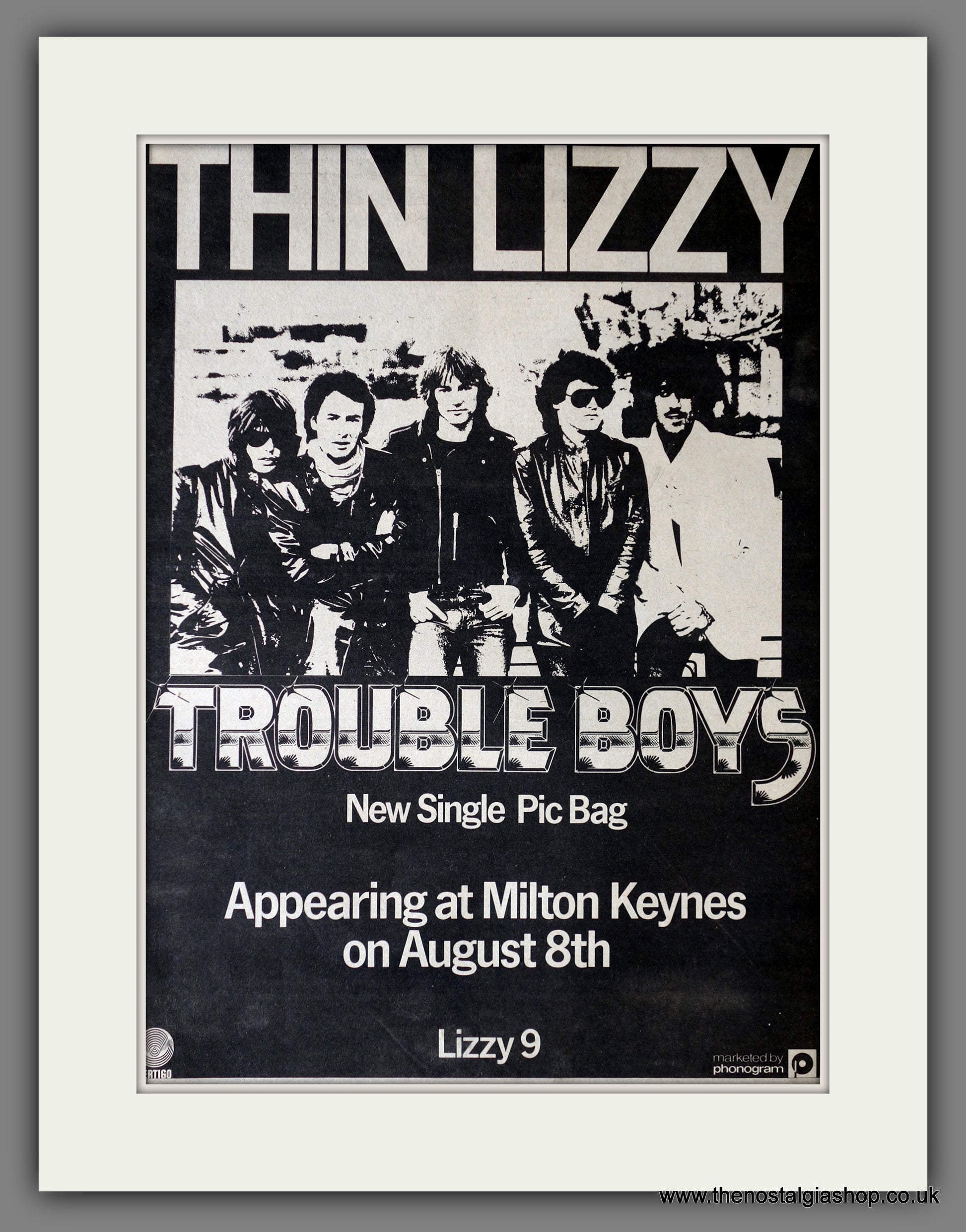 Thin Lizzy. Trouble Boys. This is a large classic Original advert 1981. Presented in cream bevel cut mount with backing card and clear bag. Ready to fit in 20 x 16 inch frame. The mounted advert will be posted via courier and well packed - protected with a sheet of hardboard to keep it rigid. Any questions or enquiries, please get in touch, we are here to help! All our adverts, unless clearly stated are Originals from the date shown. They make excellent pieces of wall art and stunning gifts. Many are rare and hard to find and once sold, may not be replaced. Remember you are buying a piece of history. Website watermark is not on original. Phil Lynott. Gary Moore, Scott Gorham, Brian Robertson, Eric Bell, Brian Downey, John Sykes.
