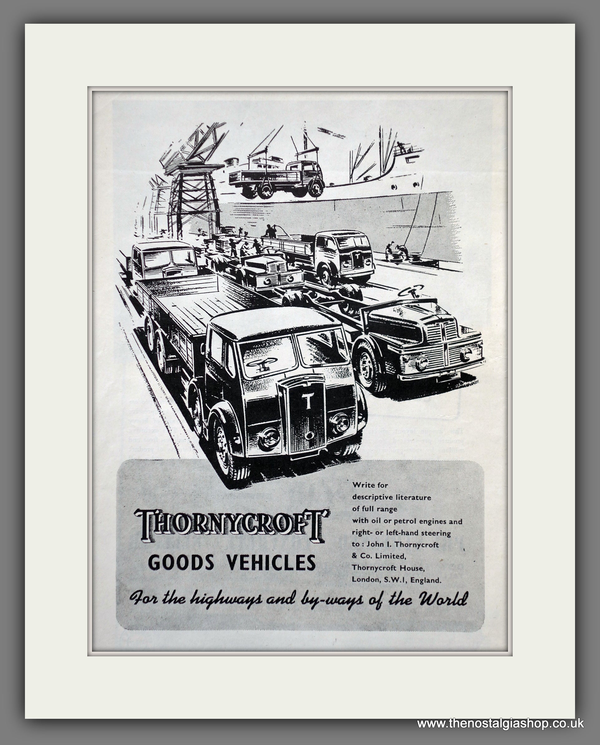 Thornycroft Trucks. Classic Original Advert 1949. It is presented and Supplied in cream bevel cut mount with backing card and Display Bag. Ready to fit in 14 x 11 inch frame. Want it framing? If so, buy these then go to Frames Available Category. Click to buy on the suitable frame and we will do the rest. All our adverts, unless clearly stated are Originals from the date shown. They make excellent pieces of wall art and stunning gifts. Many are rare and hard to find and once sold, may not be replaced. Remember you are buying a piece of history. Website watermark is not on original.