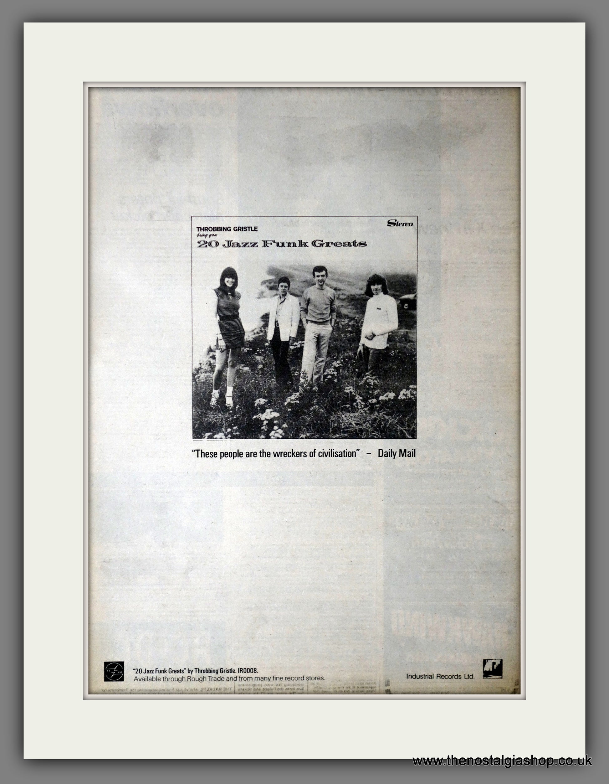 Throbbing Gristle. 20 Jazz Funk Greats. Vintage Advert. This is a large classic Original advert 1979. Presented in cream bevel cut mount with backing card and clear bag. Ready to fit in 20 x 16 inch frame. The mounted advert will be posted via courier and well packed - protected with a sheet of hardboard to keep it rigid. Any questions or inquiries, please get in touch, we are here to help! All our adverts, unless clearly stated are Originals from the date shown. They make excellent pieces of wall art and stunning gifts. Many are rare and hard to find and once sold, may not be replaced. Remember you are buying a piece of history. Website watermark is not on original.